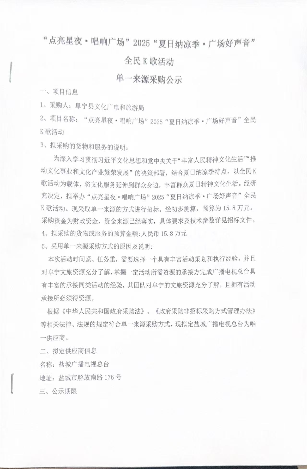 “点亮星夜·唱响广场”2025“夏日纳凉季·广场好声音”全民K歌活动单一来源采购公示