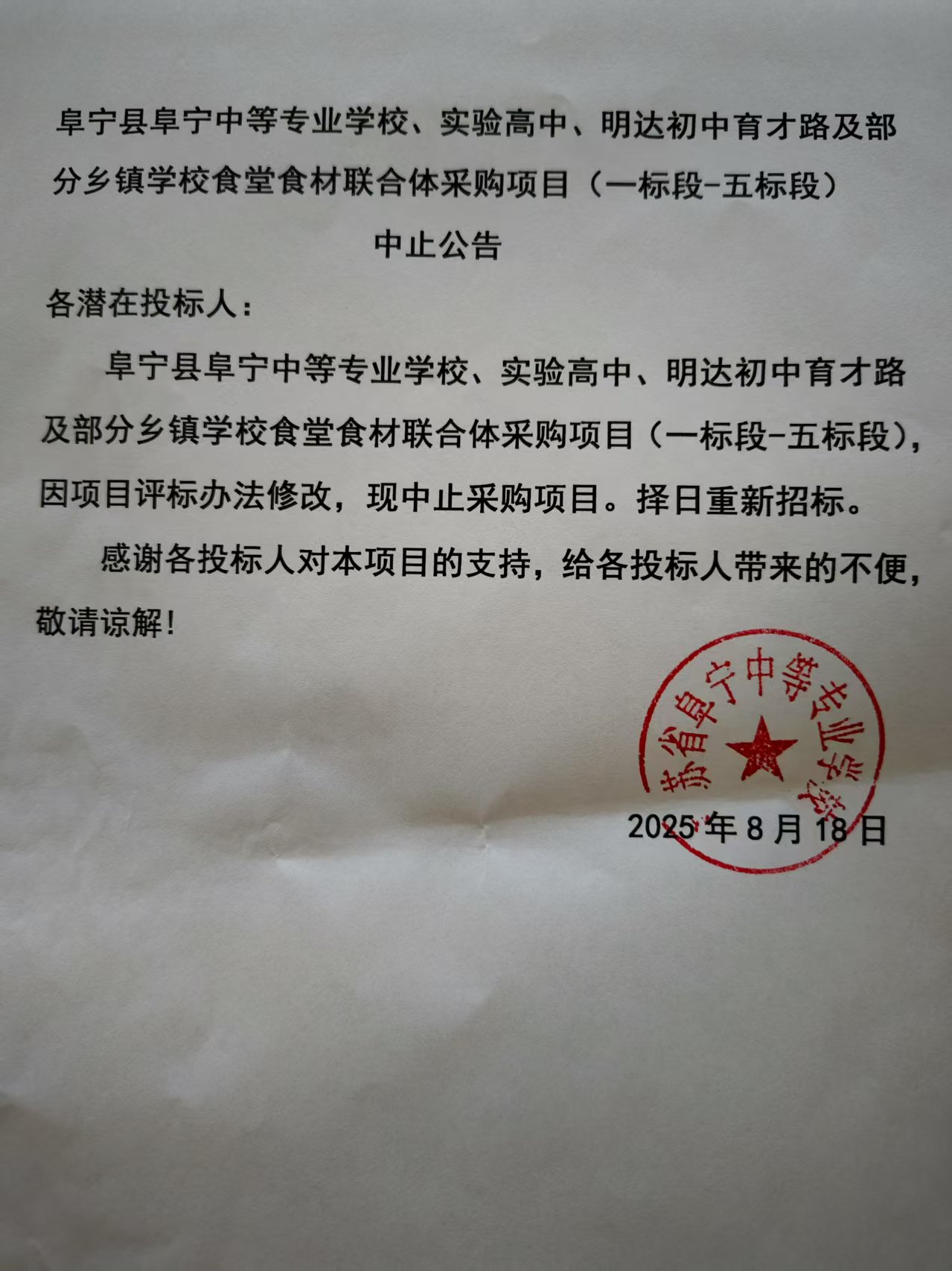 阜宁县阜宁中等专业学校、实验高中、明达初中育才路及部分乡镇学校食堂食材联合体采购项目(一标段-五标段)中止公告