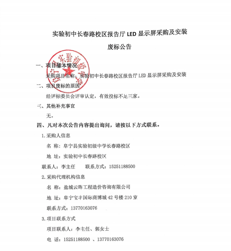 实验初中长春路校区报告厅LED显示屏采购及安装