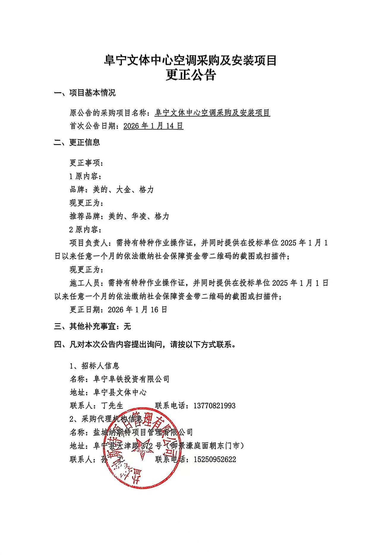 阜宁文体中心空调采购及安装项目 更正公告