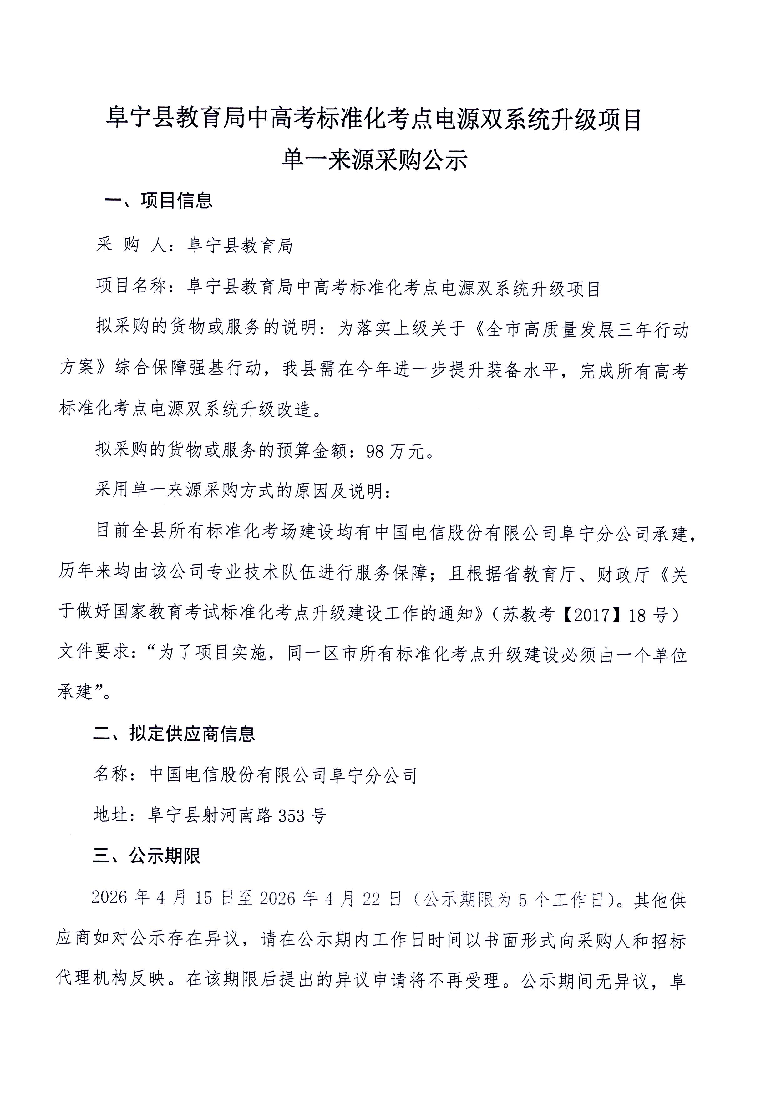 阜宁县教育局中高考标准化考点电源双系统升级项目单一来源采购公示