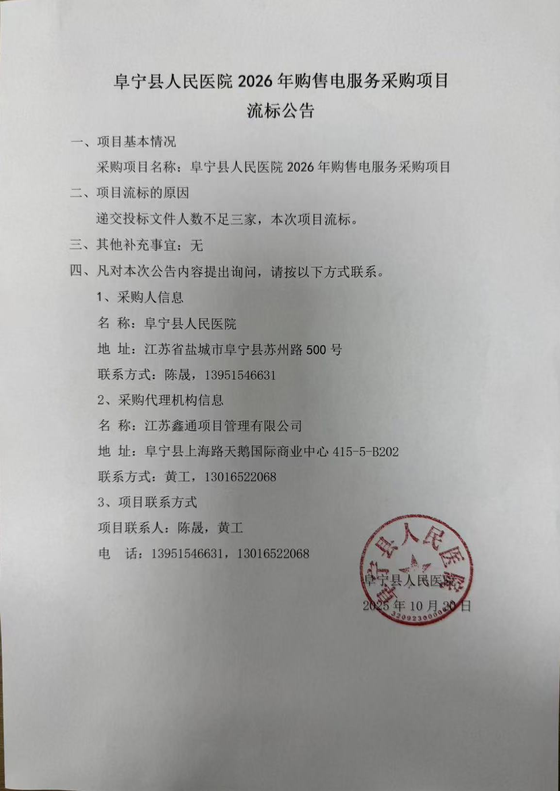阜宁县人民医院2026年购售电服务采购项目流标公告