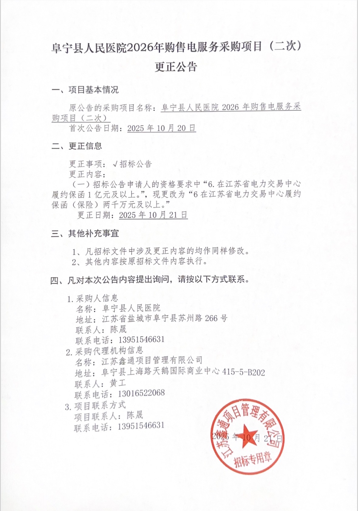 阜宁县人民医院2026年购售电服务采购项目(二次)更正公告