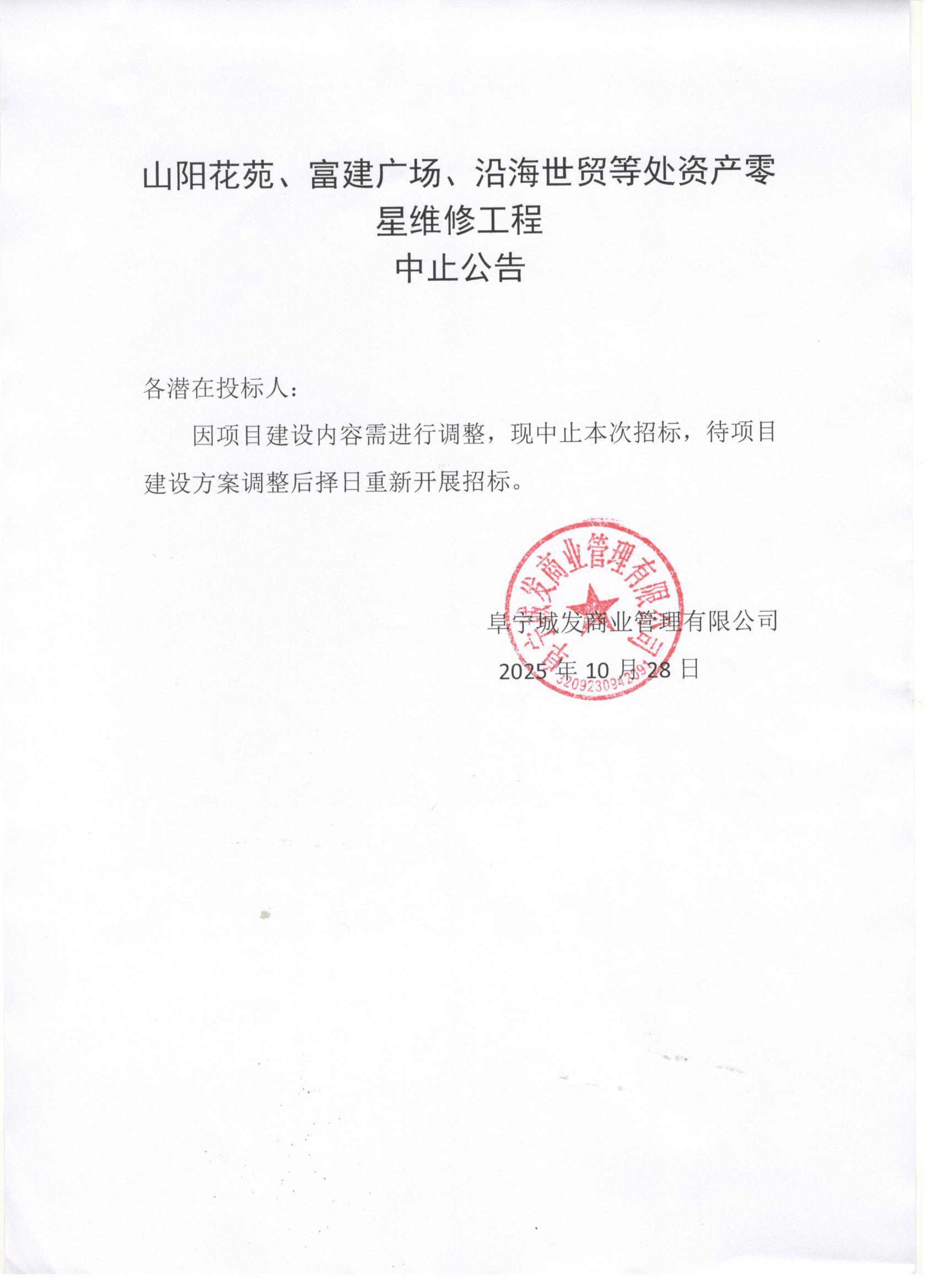 山阳花苑、富建广场、沿海世贸等处资产零星维修工程中止公告