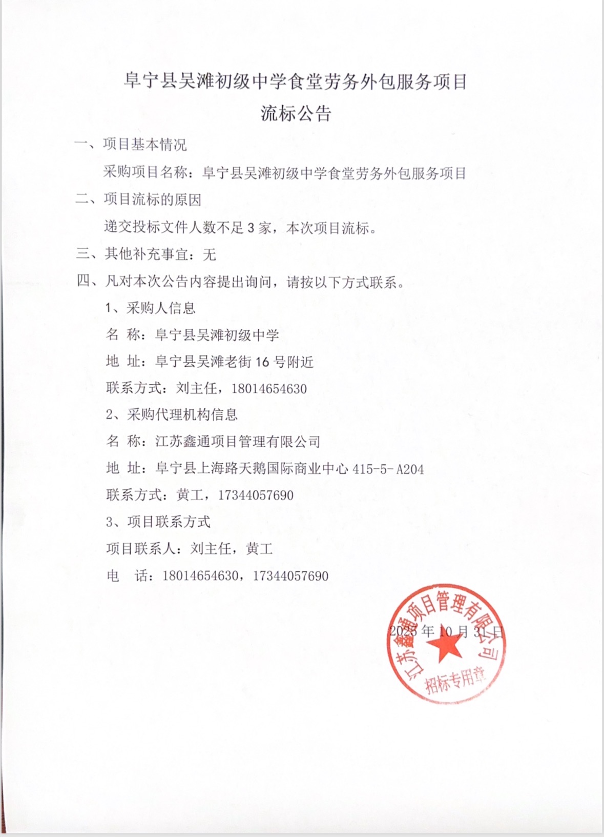 阜宁县吴滩初级中学食堂劳务外包服务项目流标公告