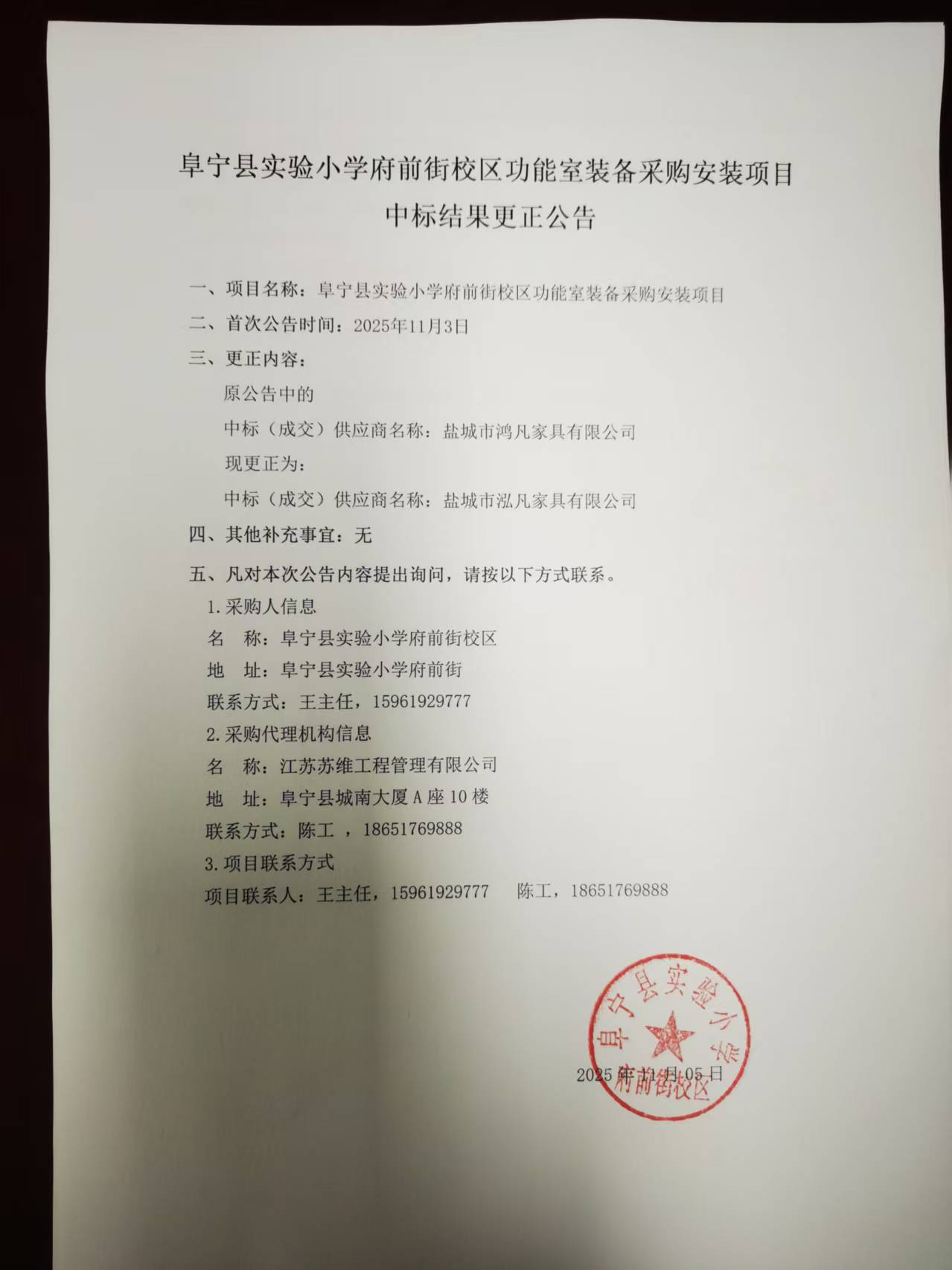 阜宁县实验小学府前街校区功能室装备采购安装项目更正公告