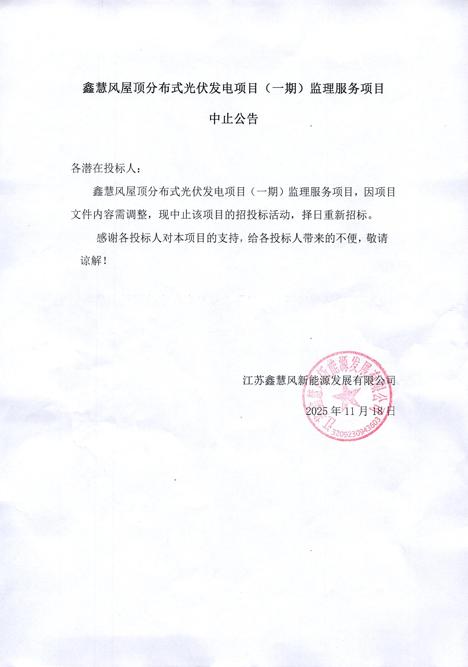 鑫慧风屋顶分布式光伏发电项目(一期)监理服务项目中止公告