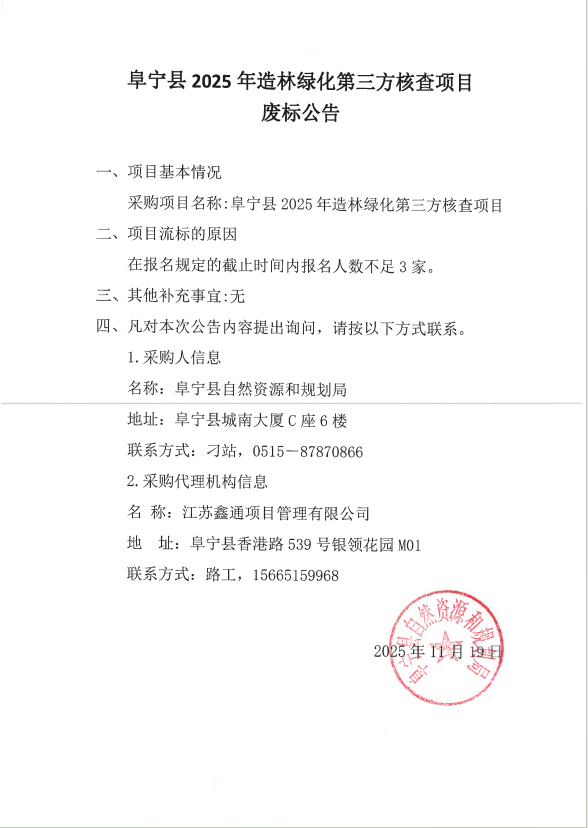 阜宁县2025年造林绿化第三方核查项目废标公告