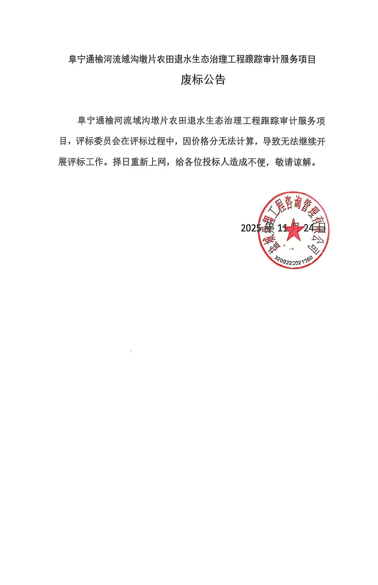 阜宁通榆河流域沟墩片农田退水生态治理工程跟踪审计服务项目废标公告