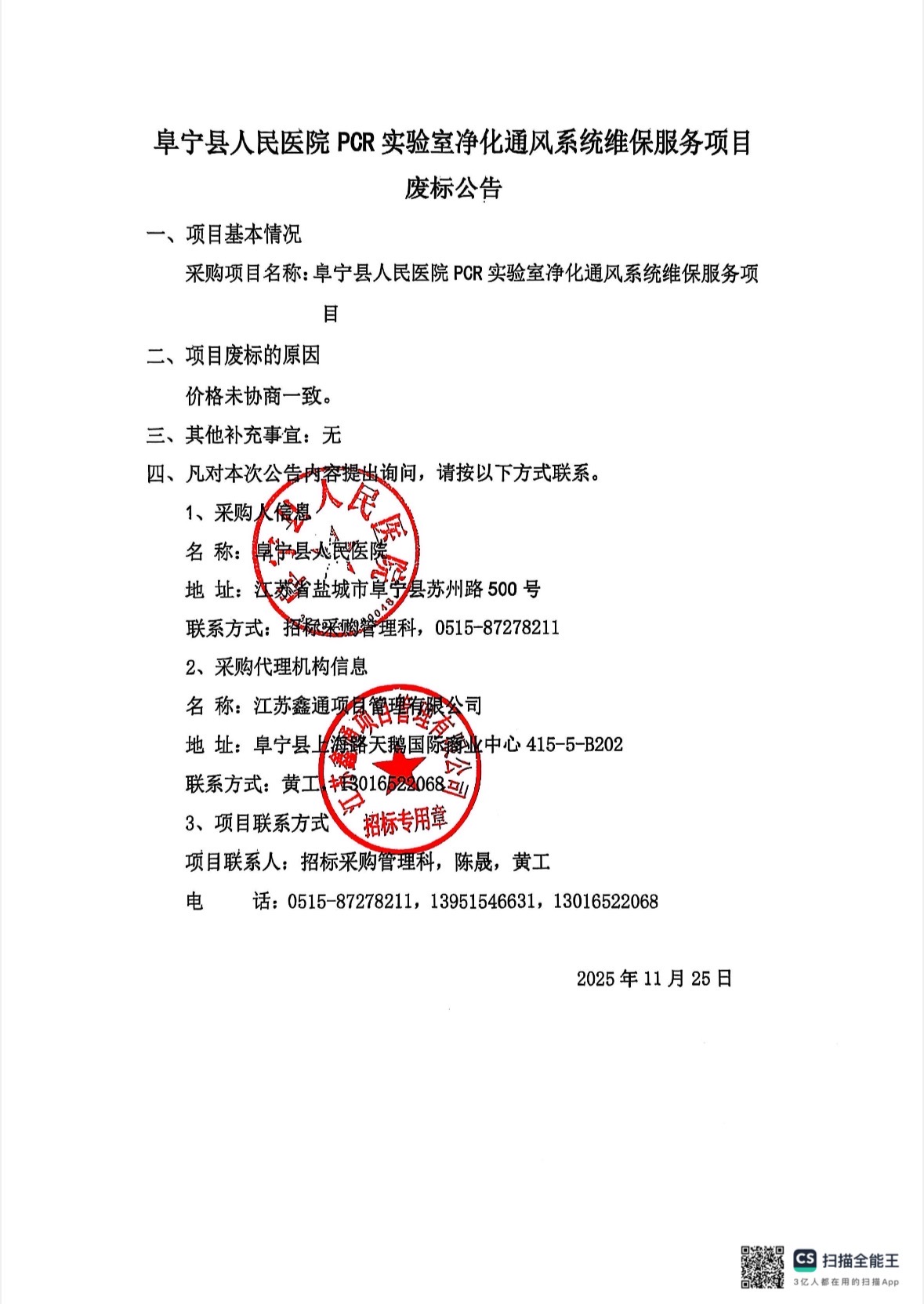 阜宁县人民医院PCR实验室净化通风系统维保服务项目废标公告