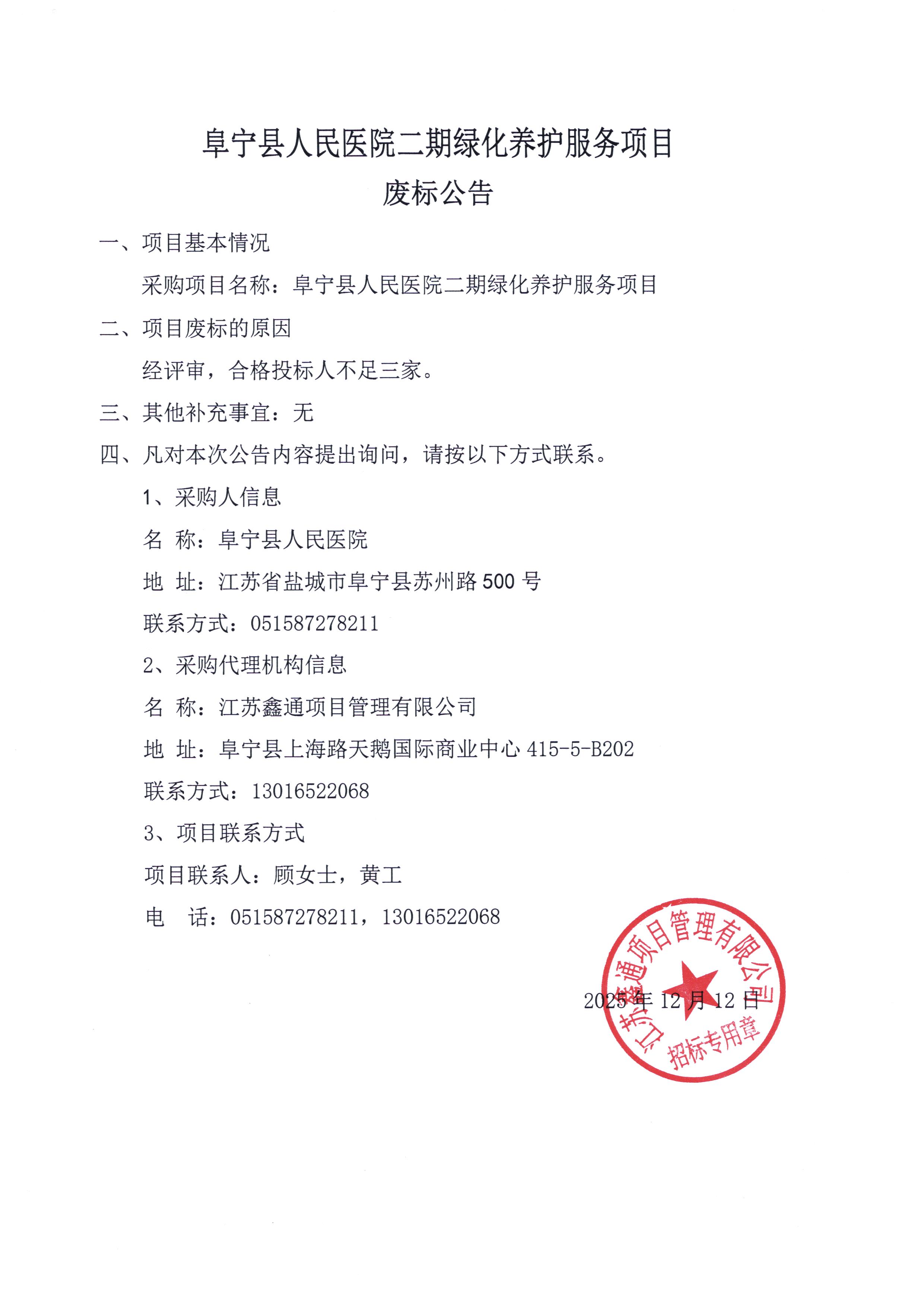 阜宁县人民医院二期绿化养护服务项目废标公告