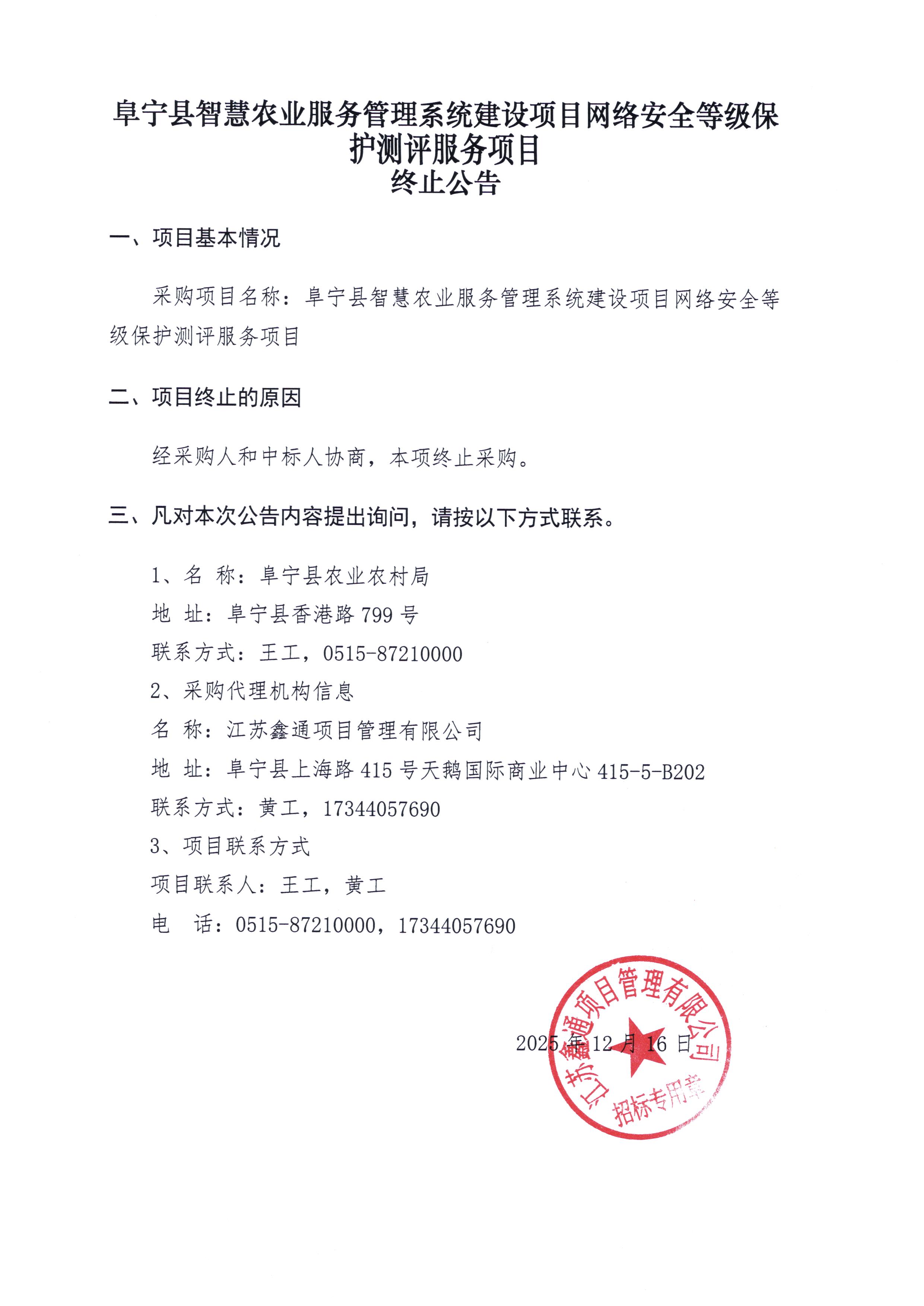 阜宁县智慧农业服务管理系统建设项目网络安全等级保护测评服务项目终止公告
