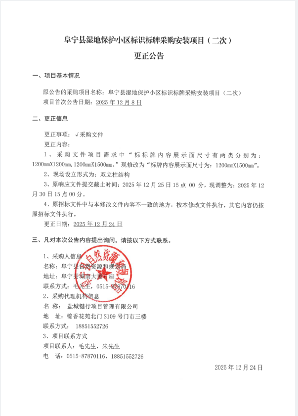 阜宁县湿地保护小区标识标牌采购安装项目(二次)
