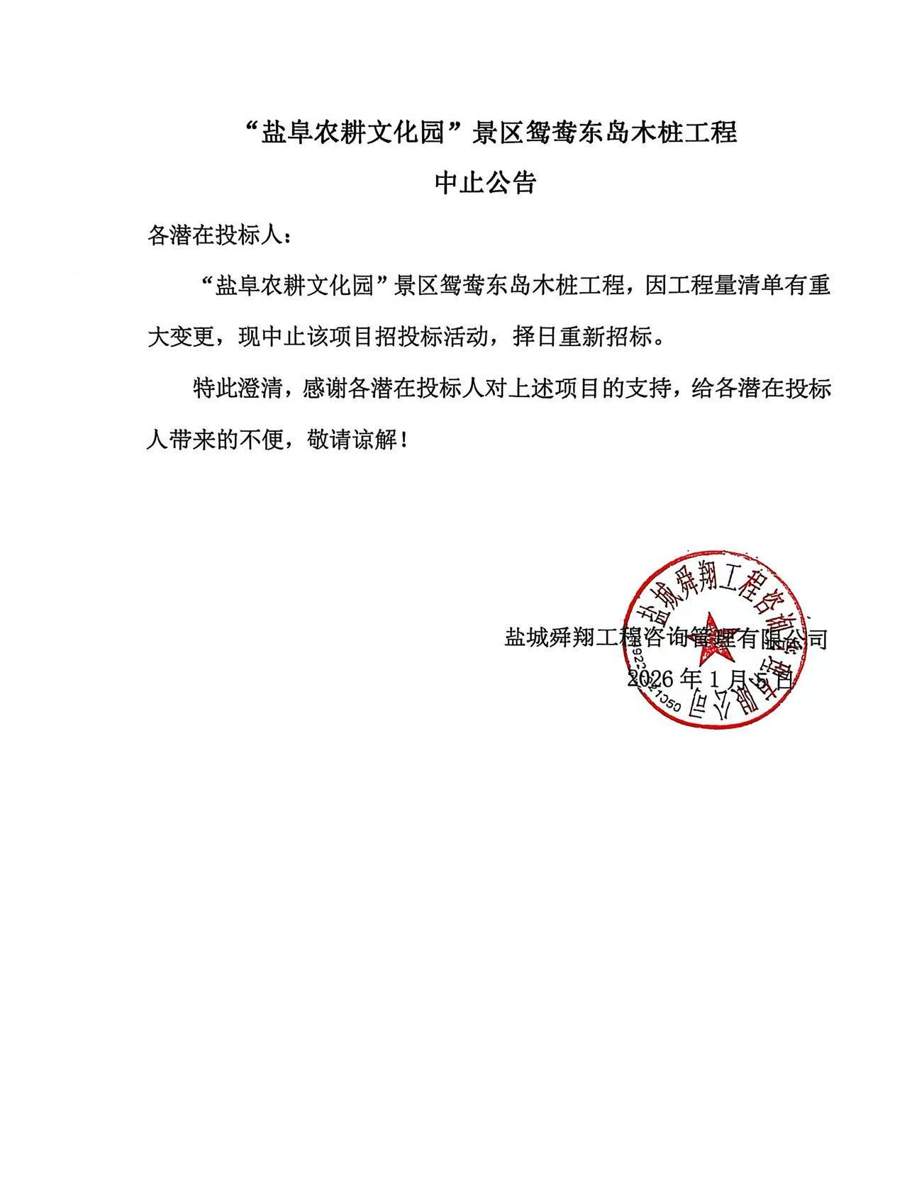 "盐阜农耕文化园"景区鸳鸯东岛木桩工程中止公告