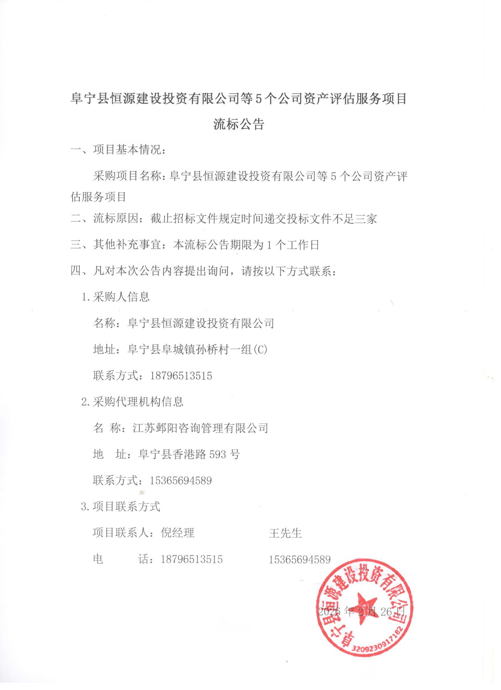 阜宁县恒源建设投资有限公司等5个公司资产评估服务项目流标公告