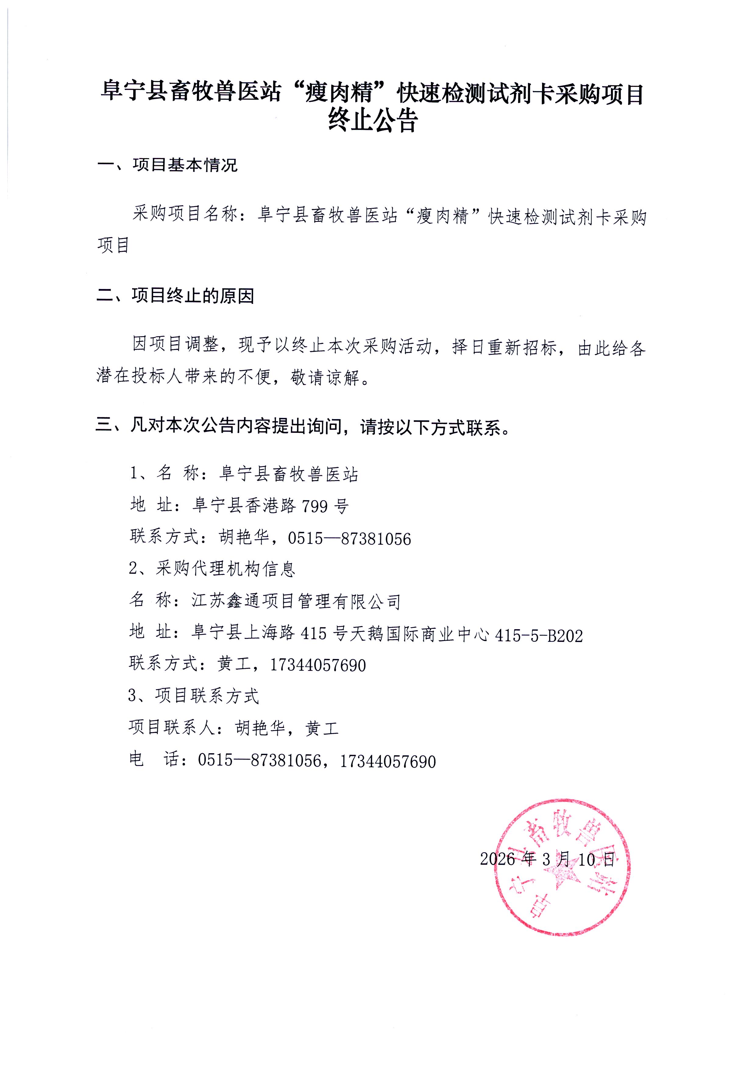 阜宁县畜牧兽医站“瘦肉精”试剂卡采购项目终止公告