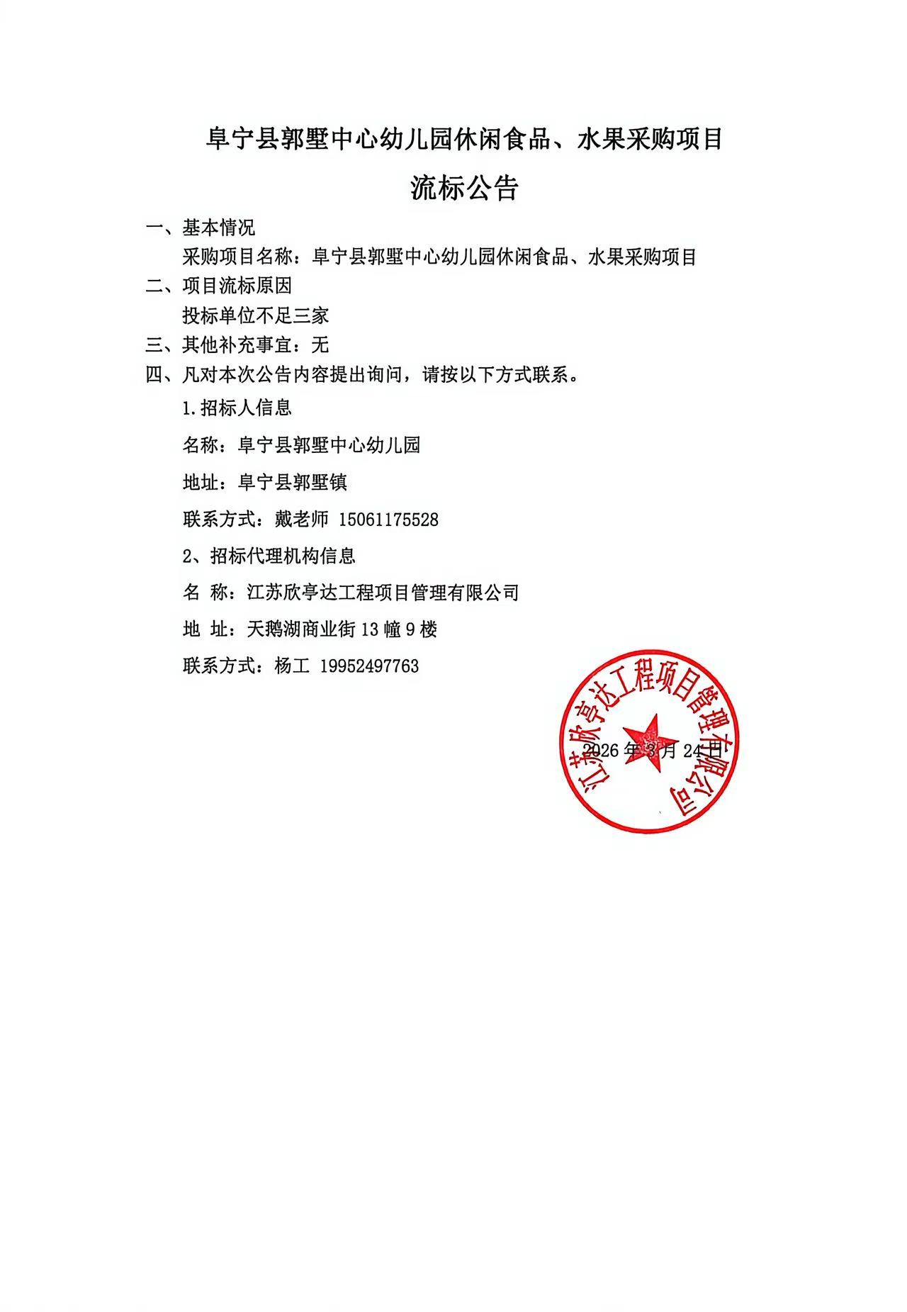 阜宁县郭墅中心幼儿园休闲食品、水果采购项目