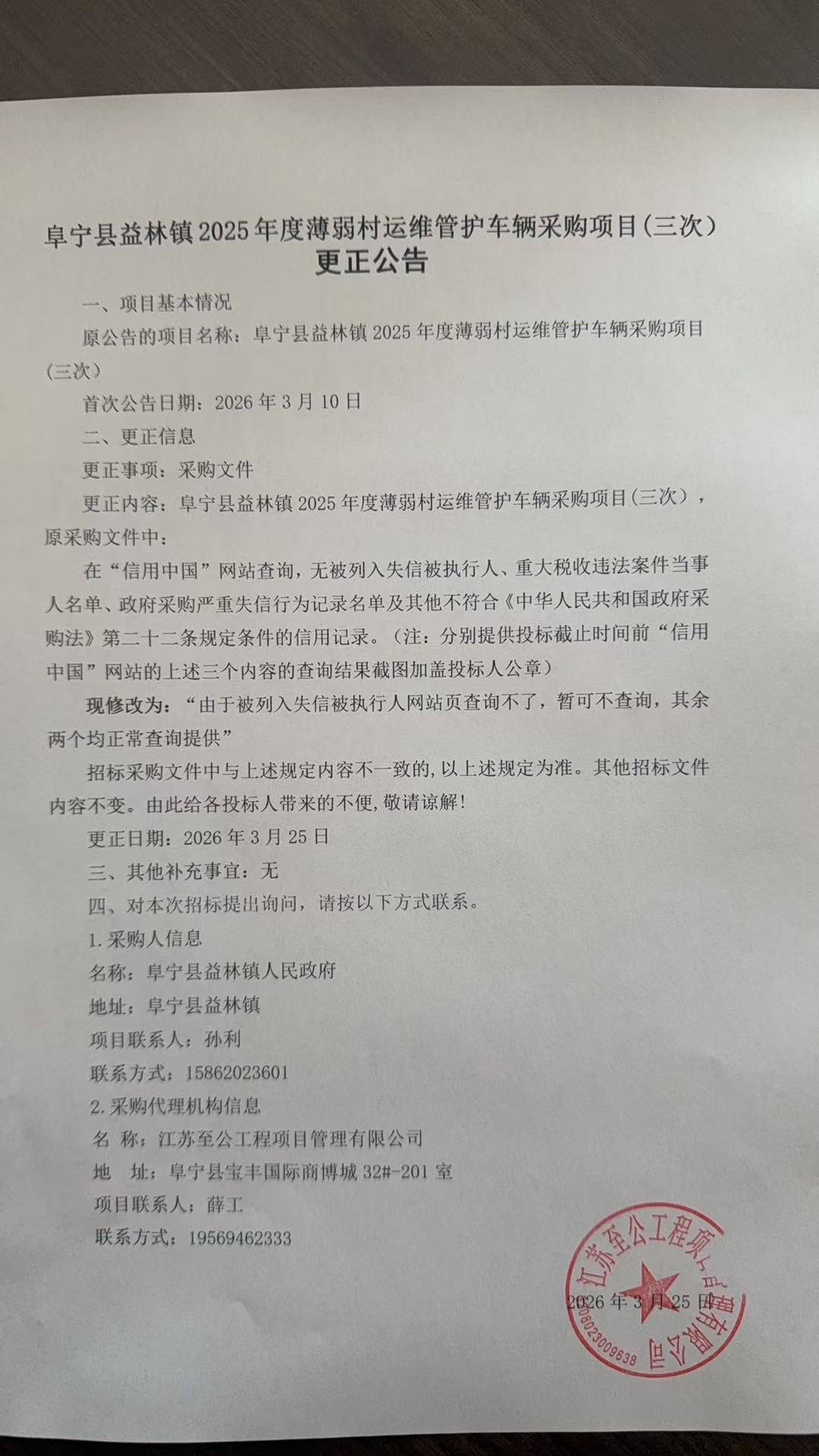阜宁县益林镇2025年度薄弱村运维管护车辆采购项目(三次)