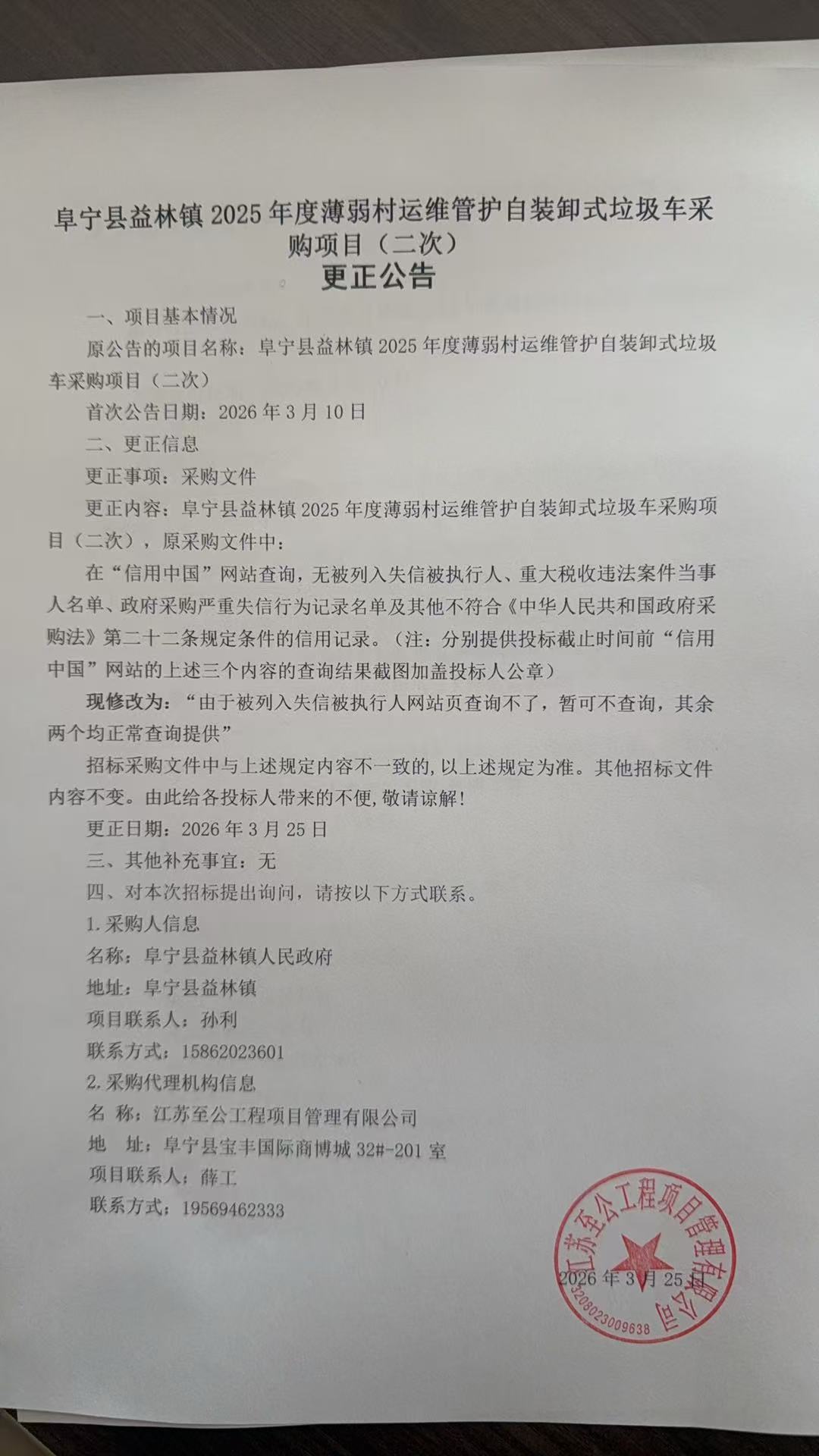 阜宁县益林镇2025年度薄弱村运维管护自装卸式垃圾车采购项目(二次)
