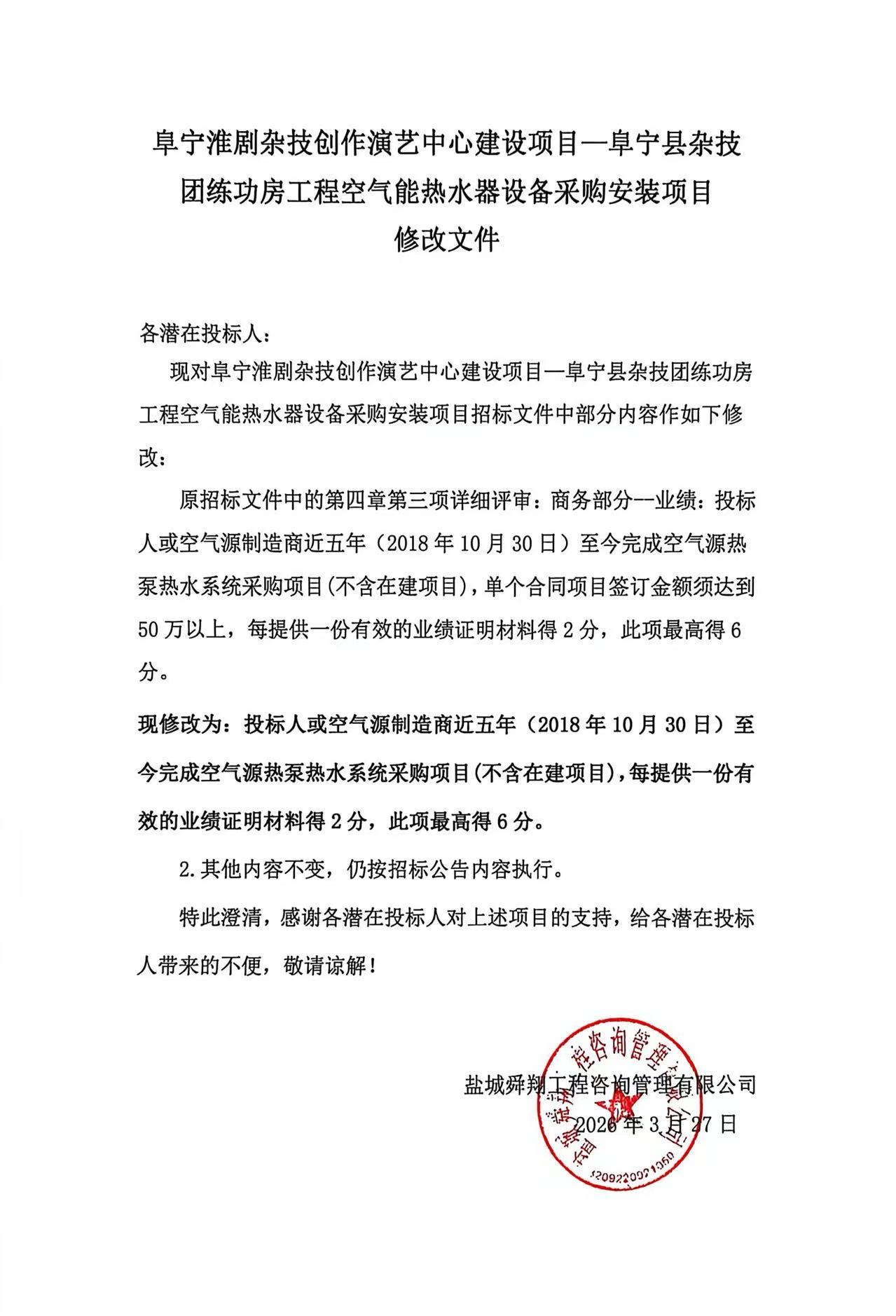 阜宁淮剧杂技创作演艺中心建设项目—阜宁县杂技团练功房工程空气能热水器设备采购安装项目修改文件