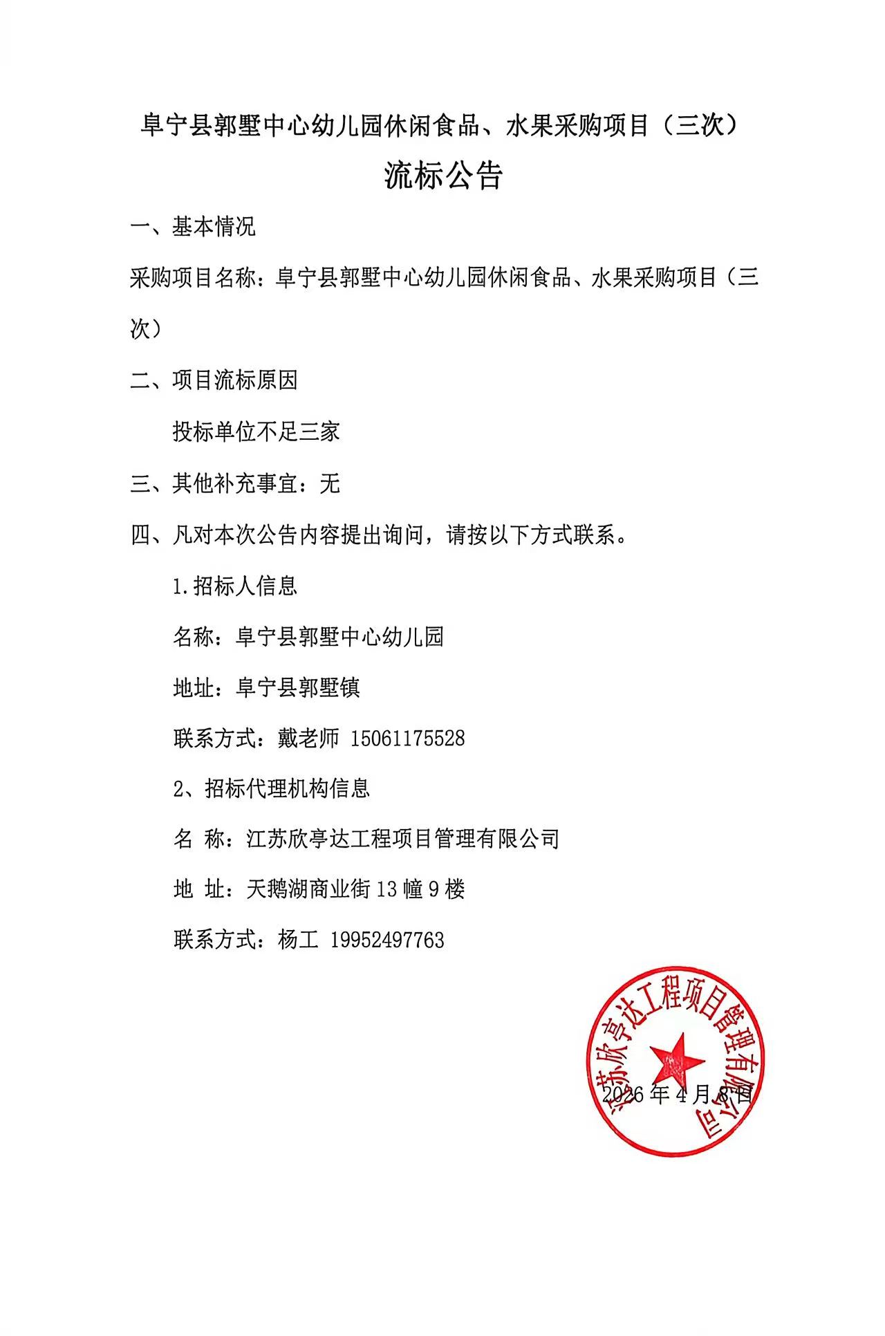 阜宁县郭墅中心幼儿园休闲食品、水果采购项目(三次)流标公告