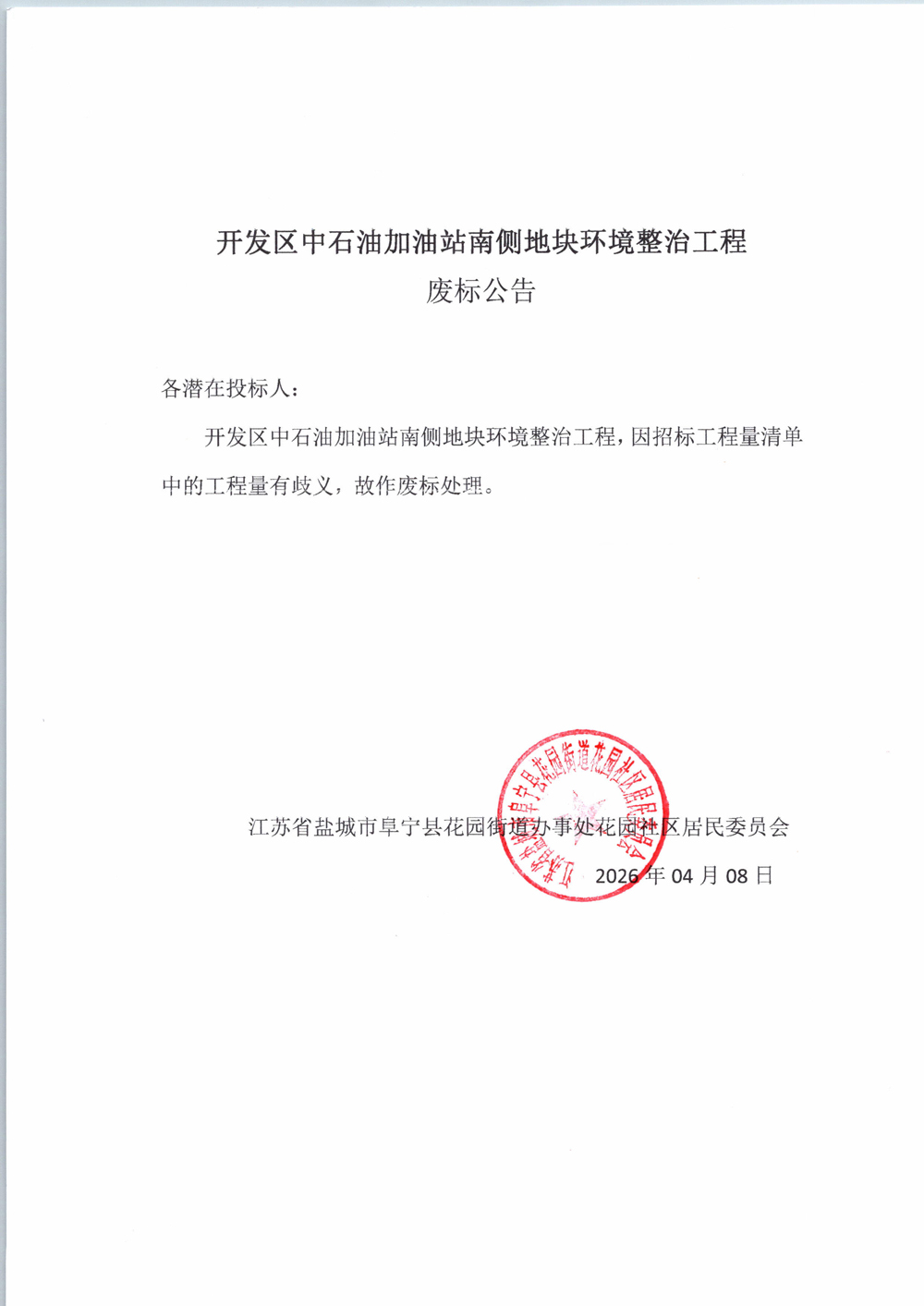 开发区中石油加油站南侧地块环境整治工程废标公告