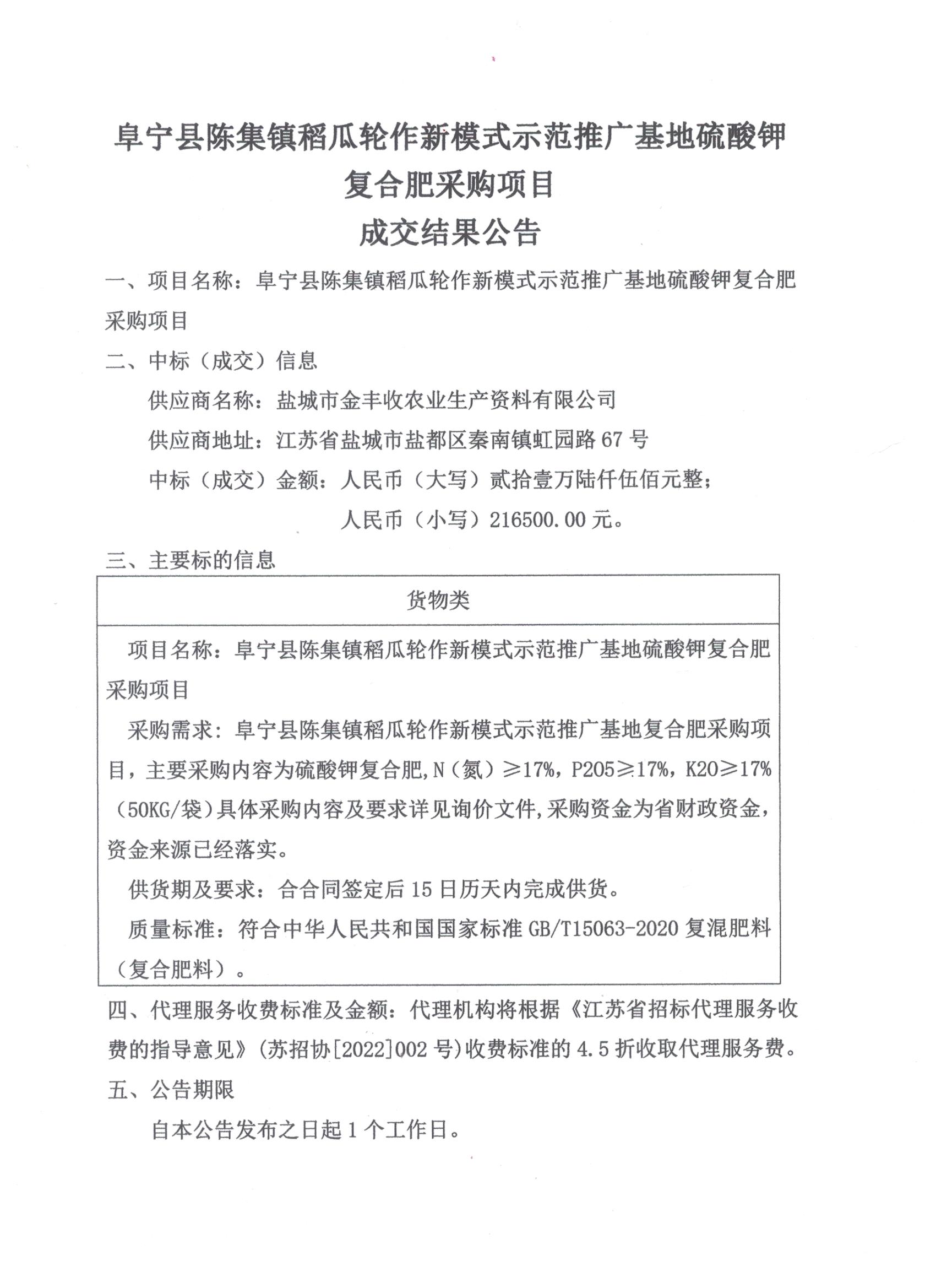 阜宁县陈集镇稻瓜轮作新模式示范推广基地复合肥采购项目
