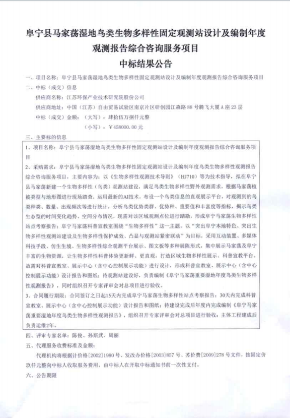 阜宁县马家荡湿地乌类生物多样性固定观测站设计及编制年度观测报告综合咨询服务项目中标结果公告