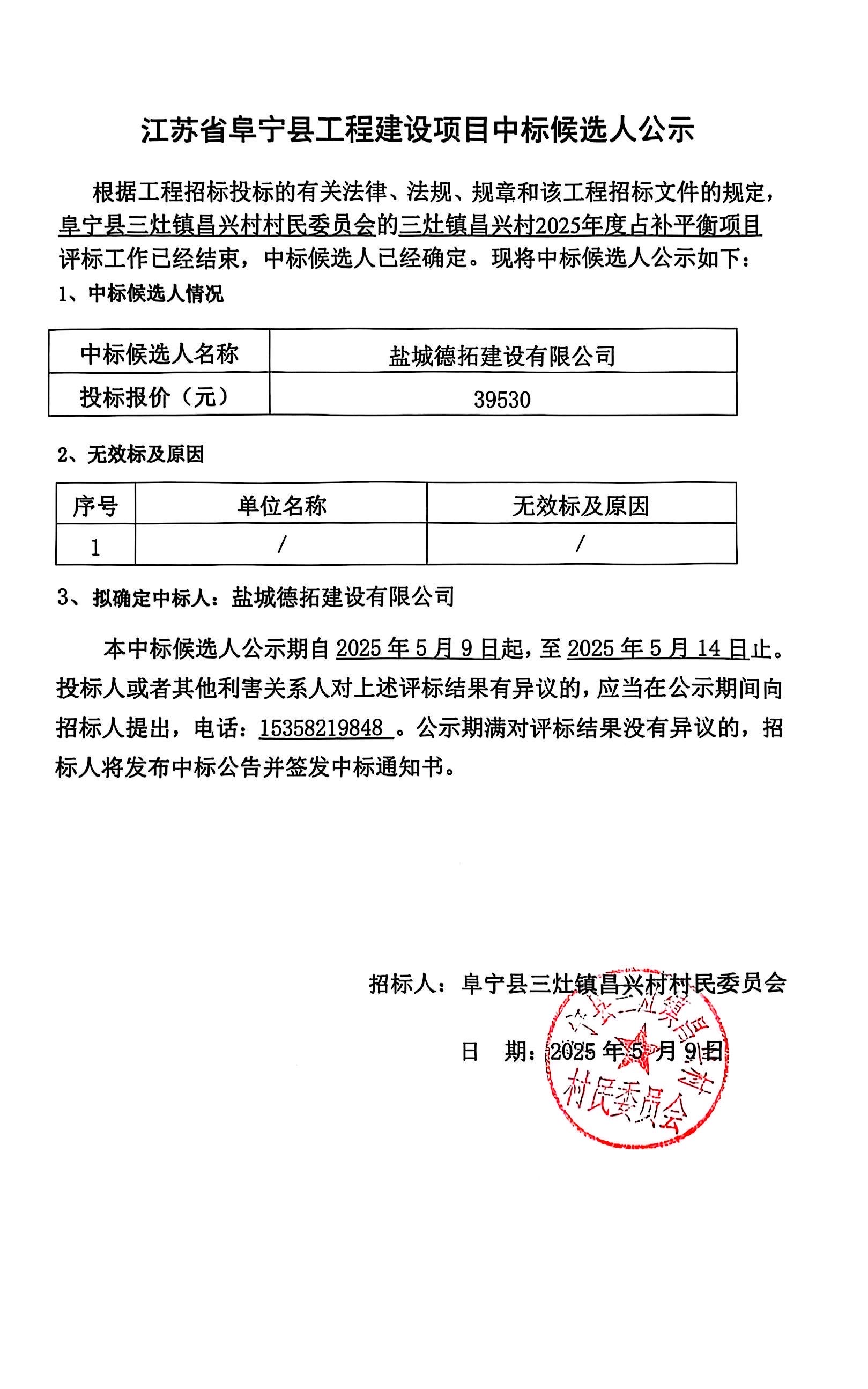 三灶镇昌兴村2025年度占补平衡项目 中标候选人公示