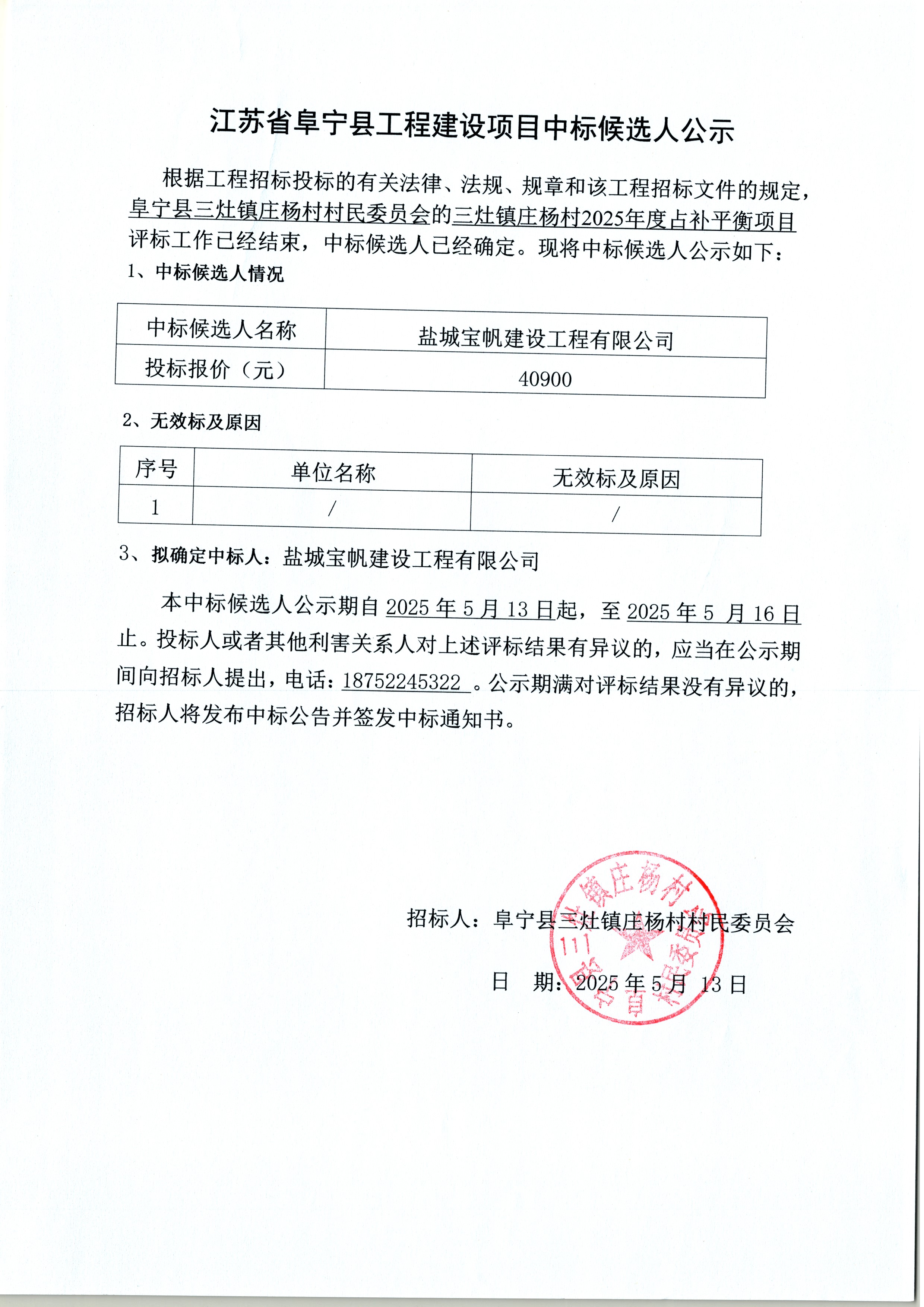 三灶镇庄杨村2025年度占补平衡项目 中标候选人公示
