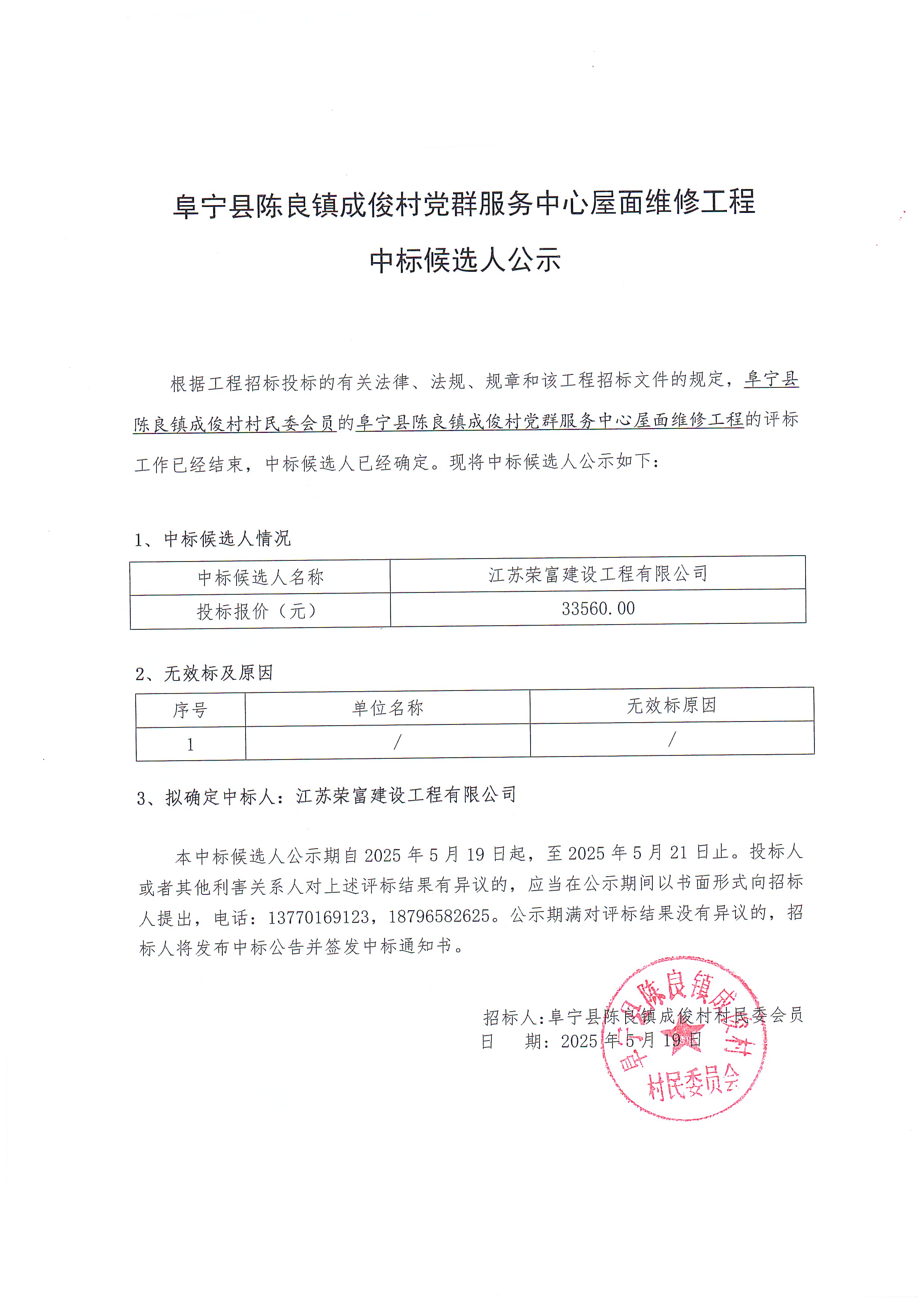 阜宁县陈良镇成俊村党群服务中心屋面维修工程中标候选人公示