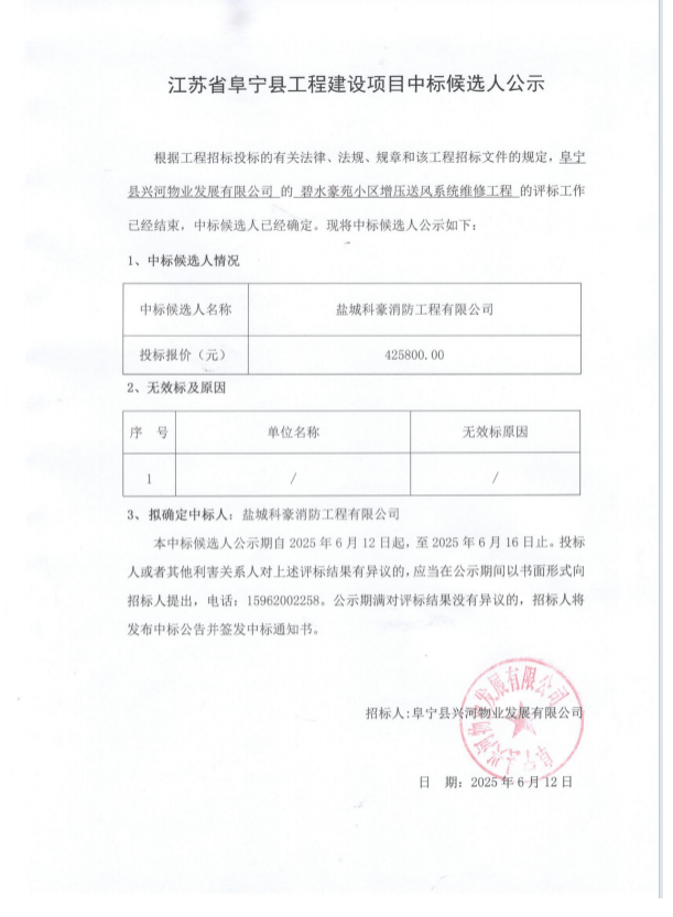 碧水豪苑小区增压送风系统维修工程中标公告