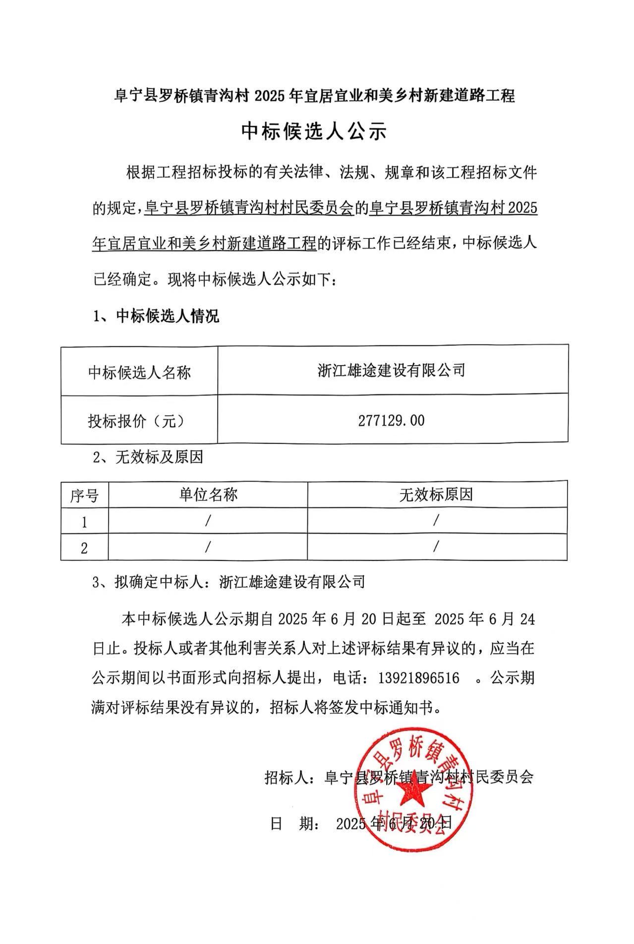 阜宁县罗桥镇青沟村2025年宜居宜业和美乡村新建道路工程中标候选人公示