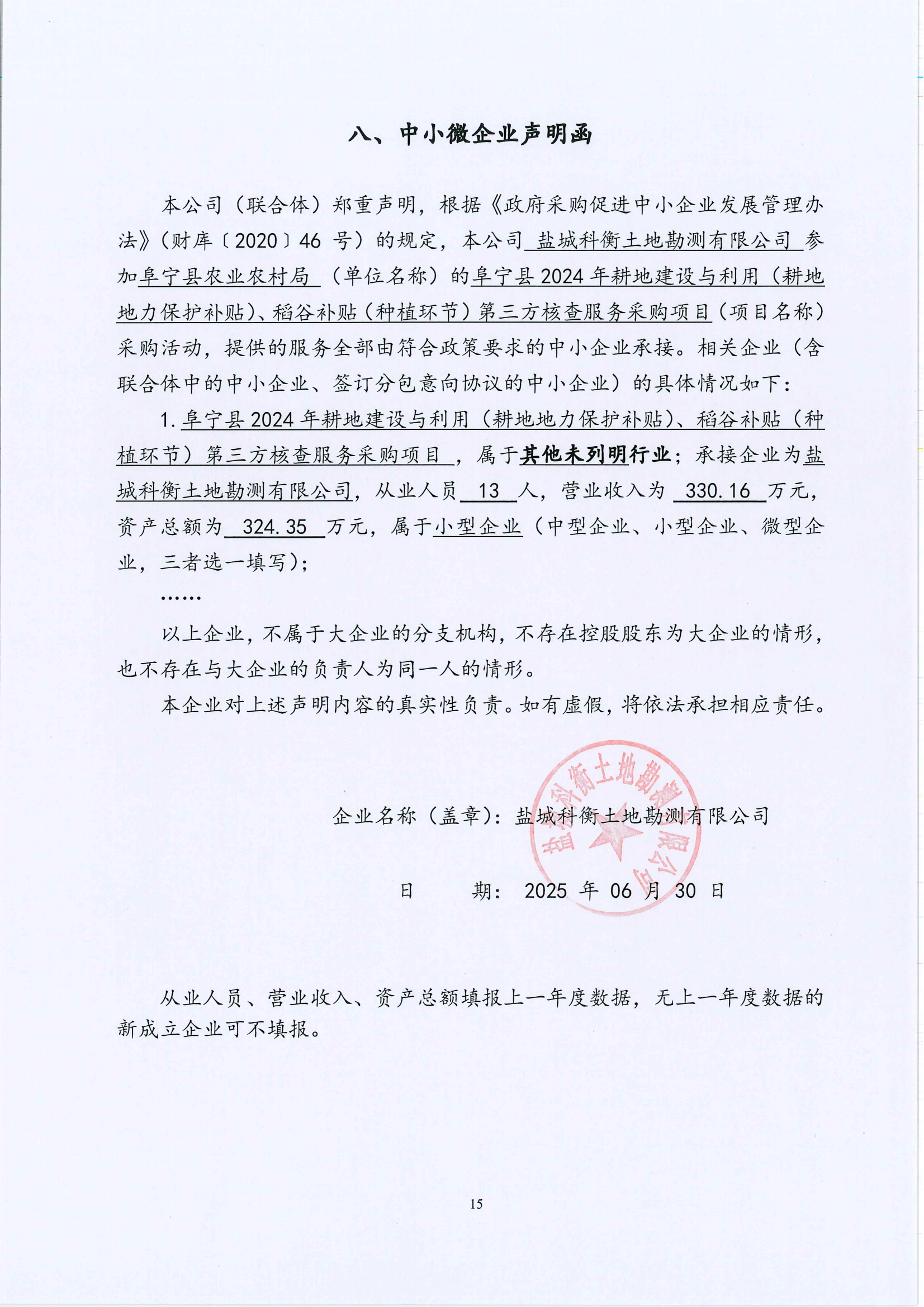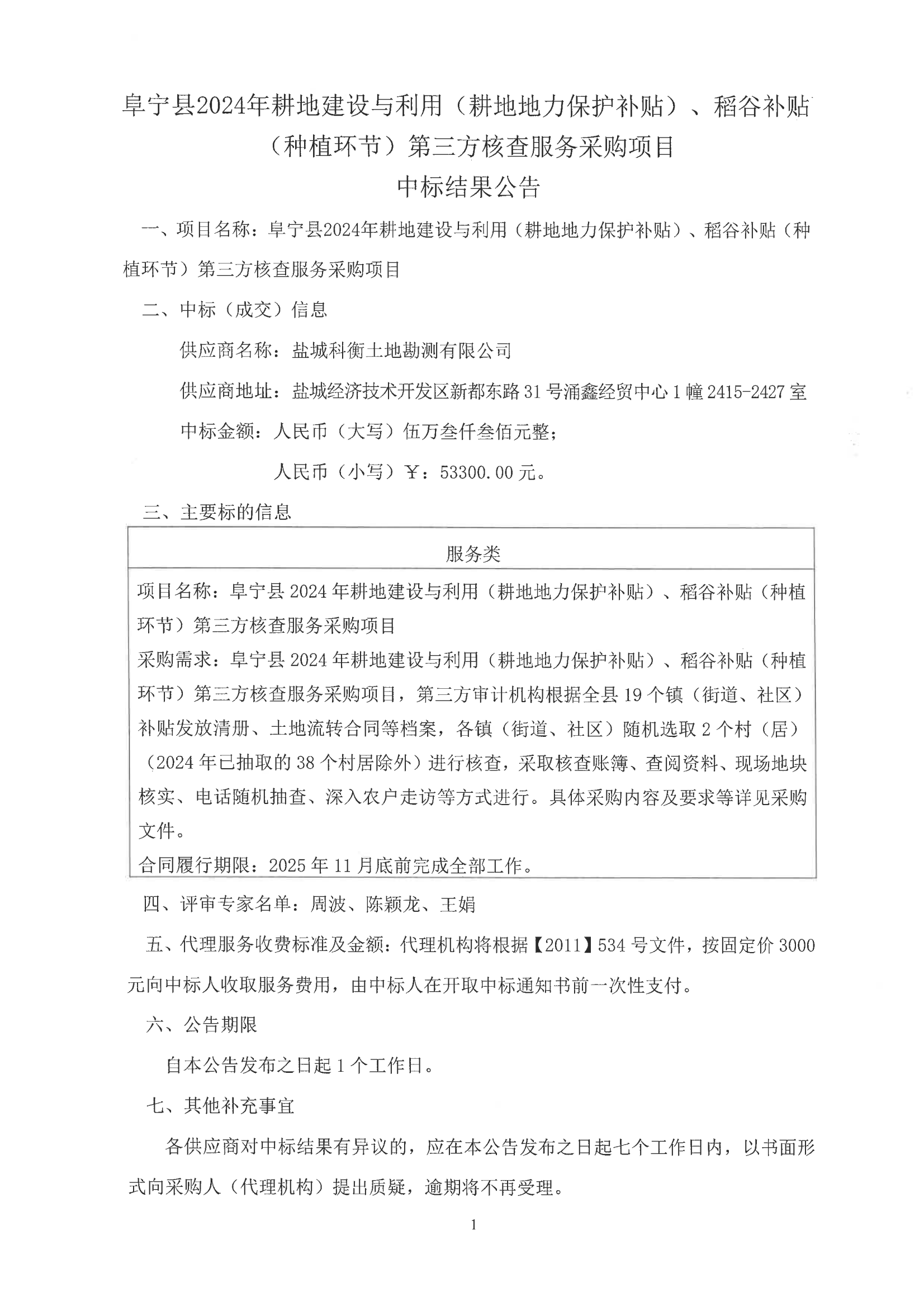 阜宁县2024年耕地建设与利用(耕地地力保护补贴)、稻谷补贴(种植环节)第三方核查服务采购项目中标结果公告