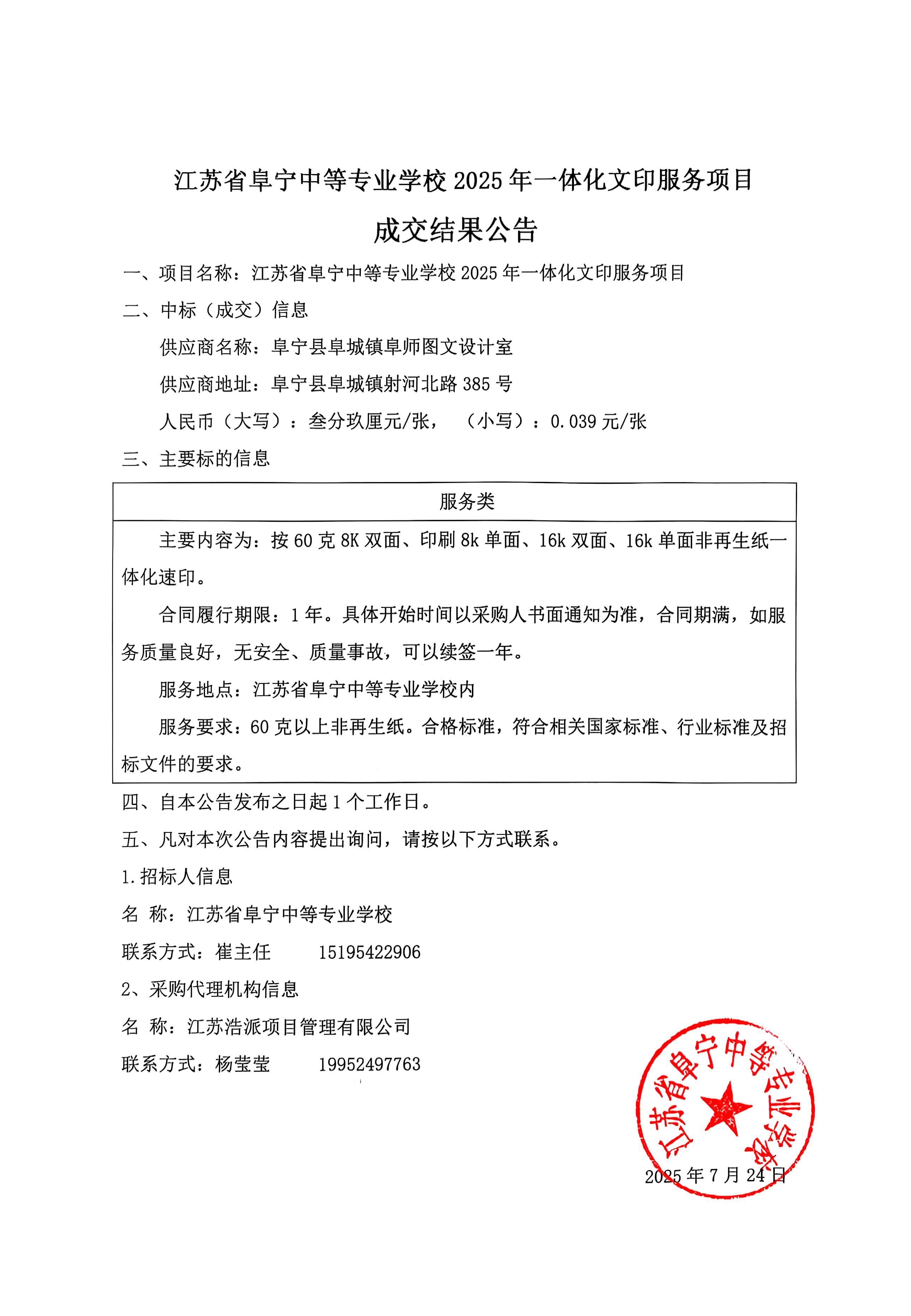 江苏省阜宁中等专业学校2025年一体化文印服务项目
