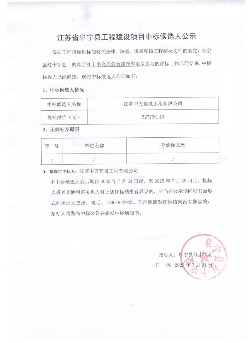 阜宁红十字会应急救援仓库用房工程中标公告