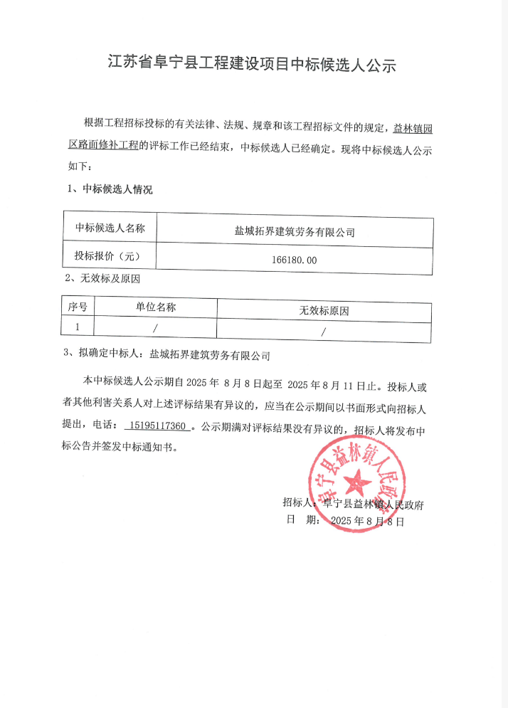 益林镇园区路面修补工程中标候选人公示
