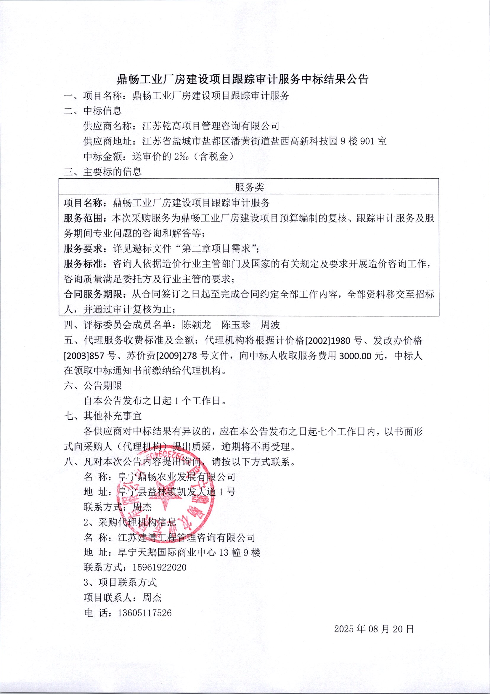 鼎畅工业厂房建设项目跟踪审计服务中标结果公告