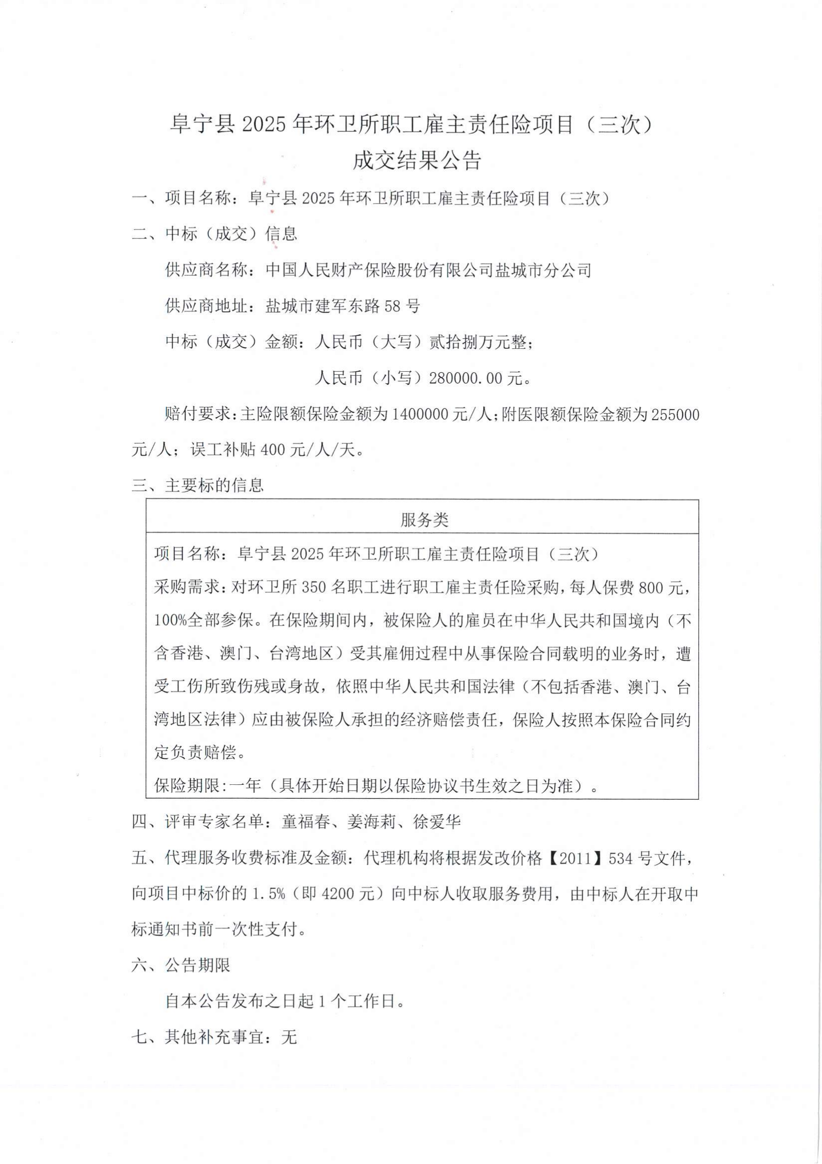 阜宁县2025年环卫所职工雇主责任险项目(三次)成交结果公告