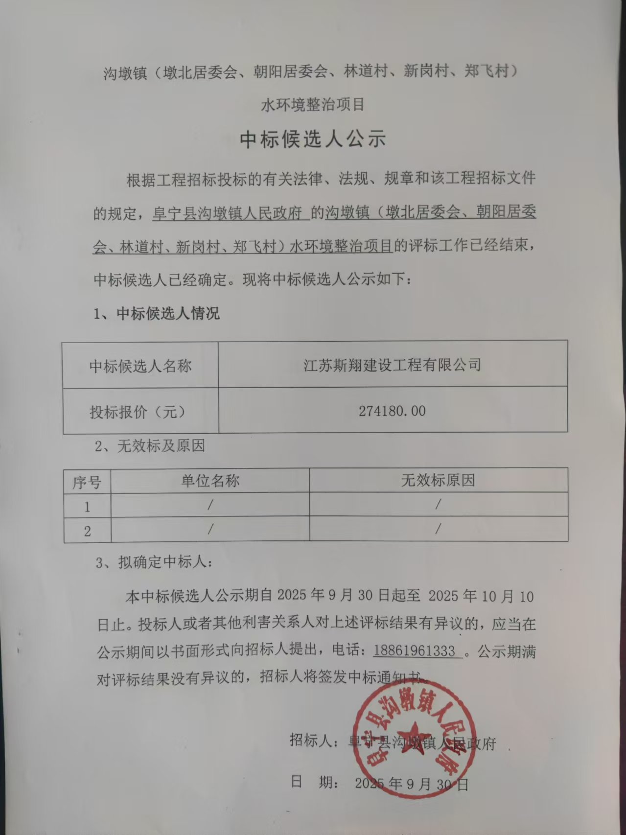 沟墩镇(墩北居委会、朝阳居委会、林道村、新岗村、郑飞村)水环境整治项目中标候选人公示