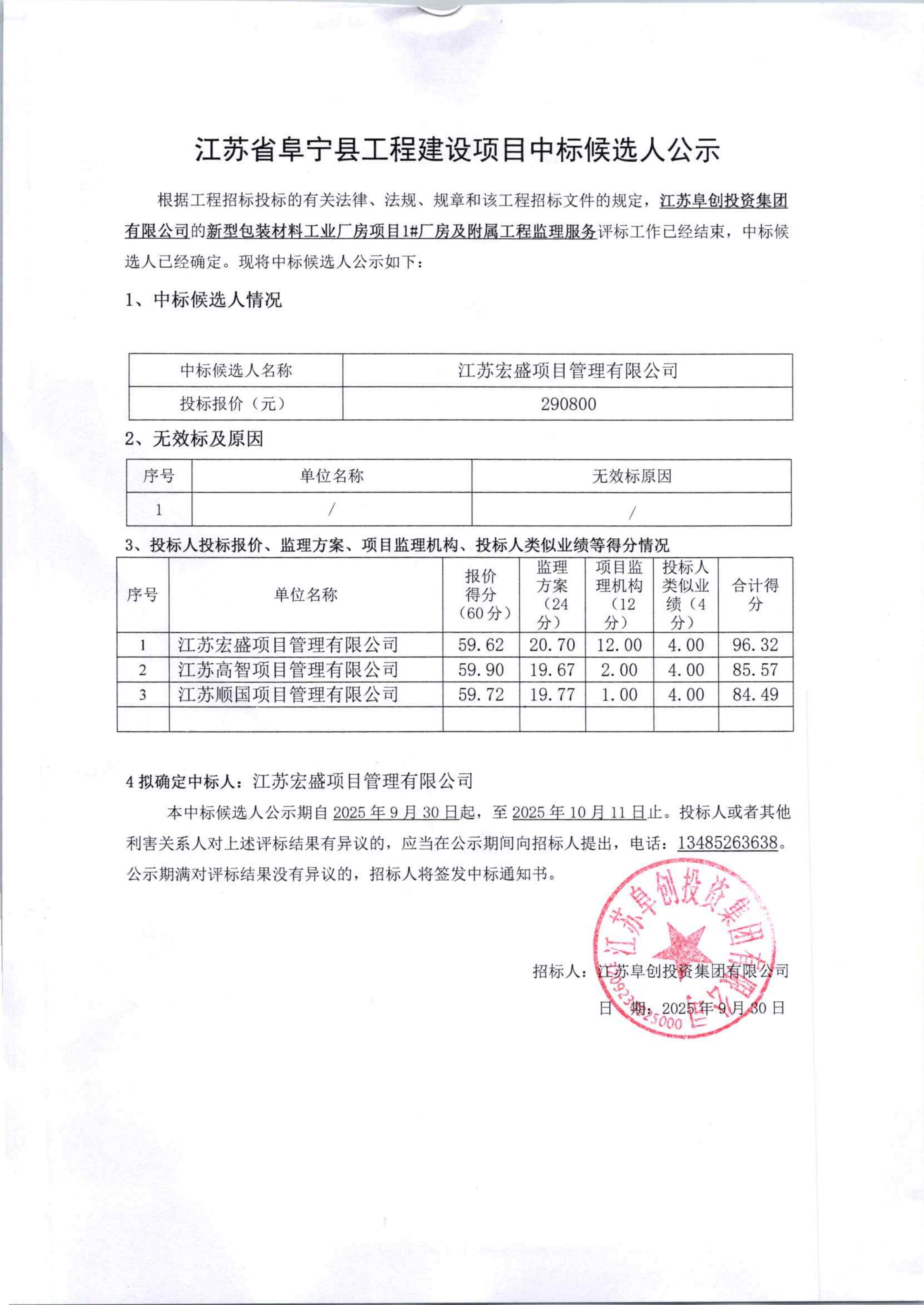 新型包装材料工业厂房项目1#厂房及附属工程监理服务中标候选人公示
