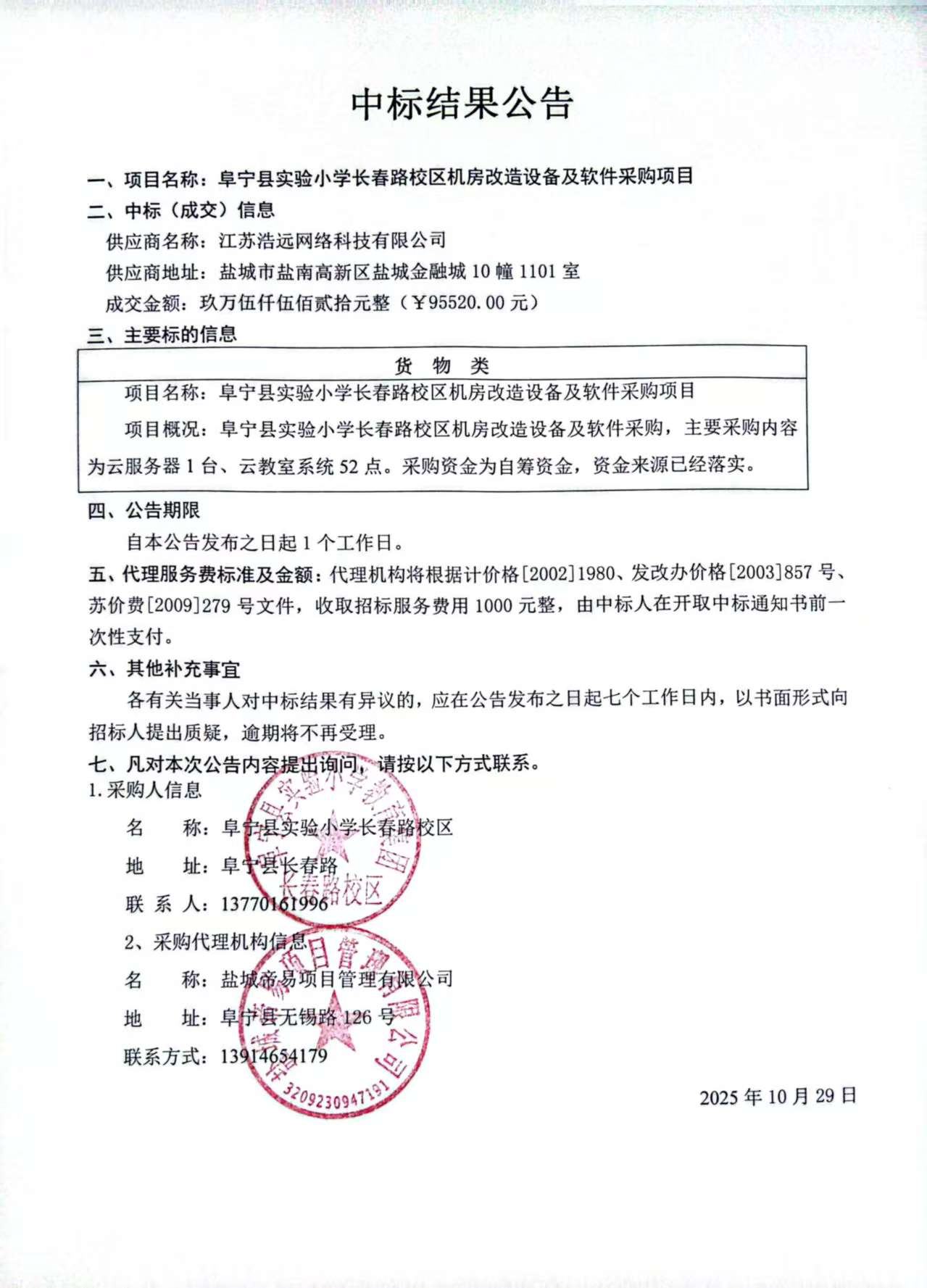 阜宁县实验小学长春路校区机房改造设备及软件采购项目中标公告