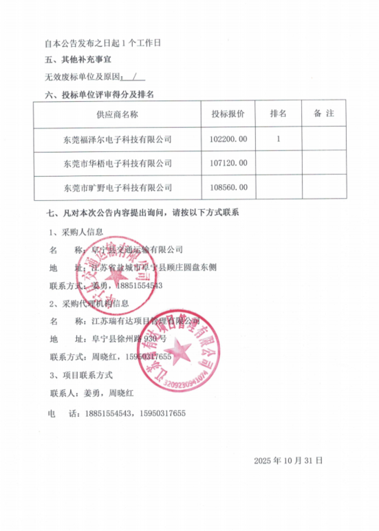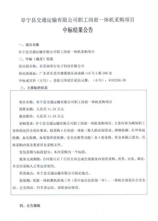 阜宁县交通运输有限公司职工岗前一体机采购项目中标结果公告