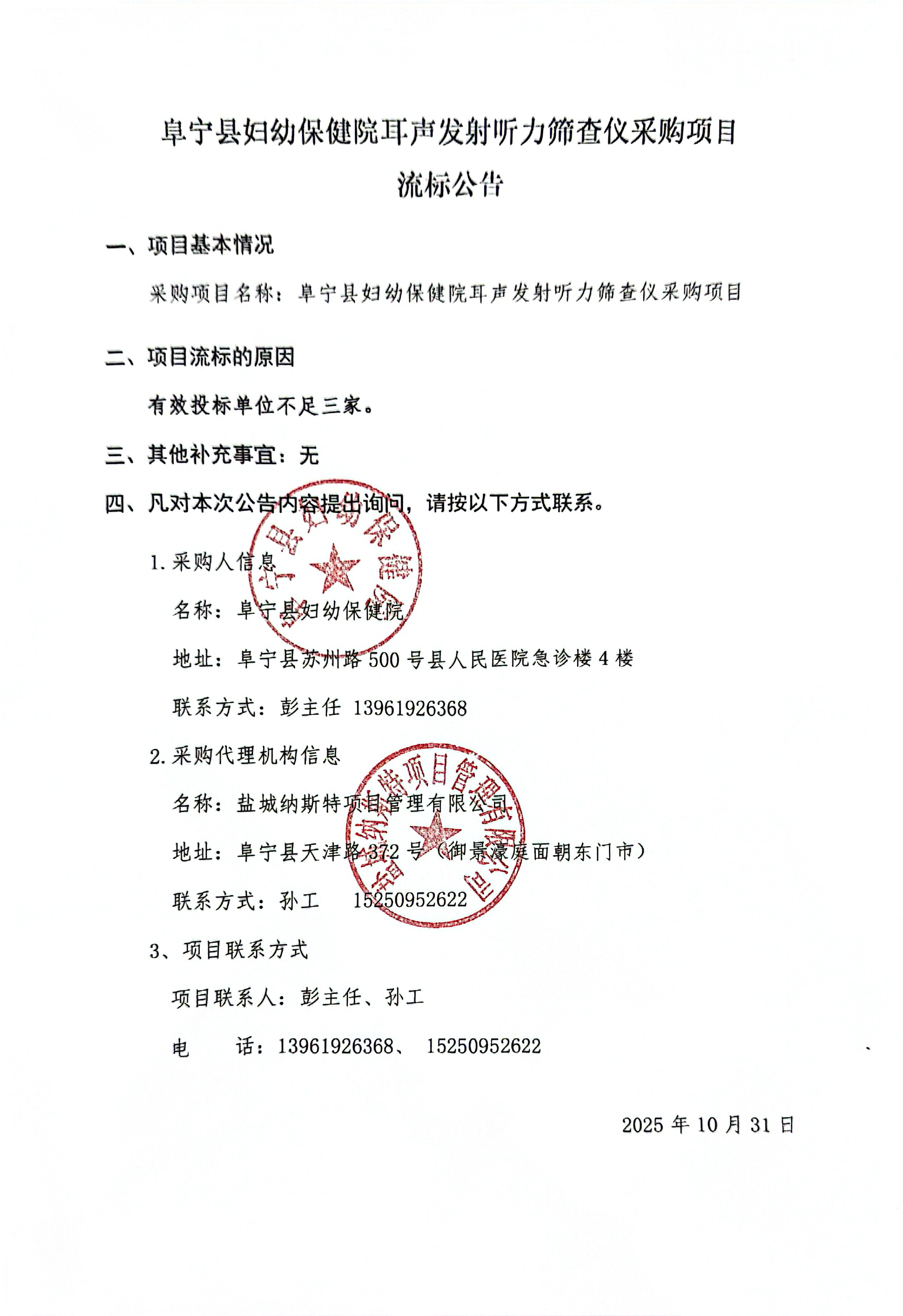 阜宁县妇幼保健院耳声发射听力筛查仪采购项目流标公告