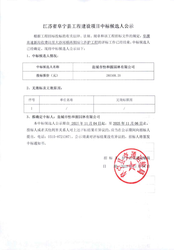 阜溧高速新沟收费站至大沙河桥两侧绿化养护工程中标候选人公示