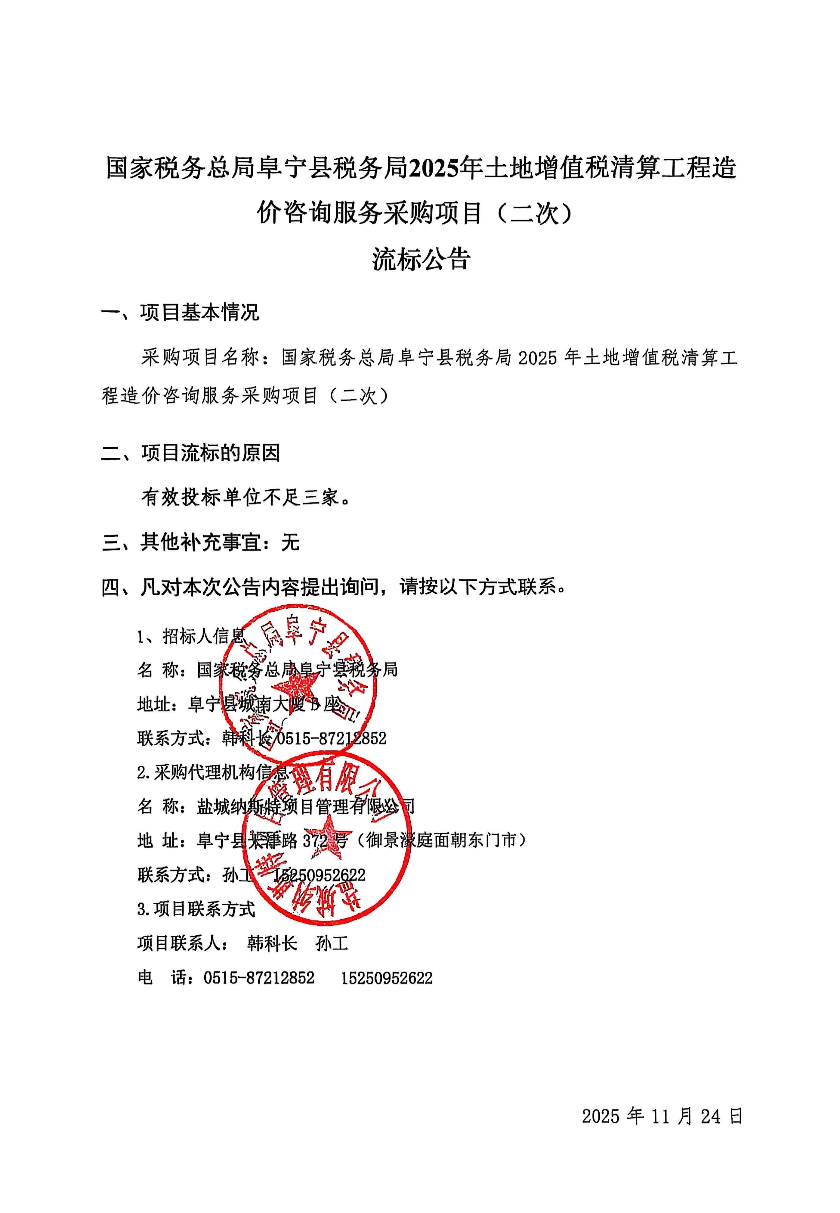 国家税务总局阜宁县税务局2025年土地增值税清算工程造价咨询服务采购项目(二次)流标公告