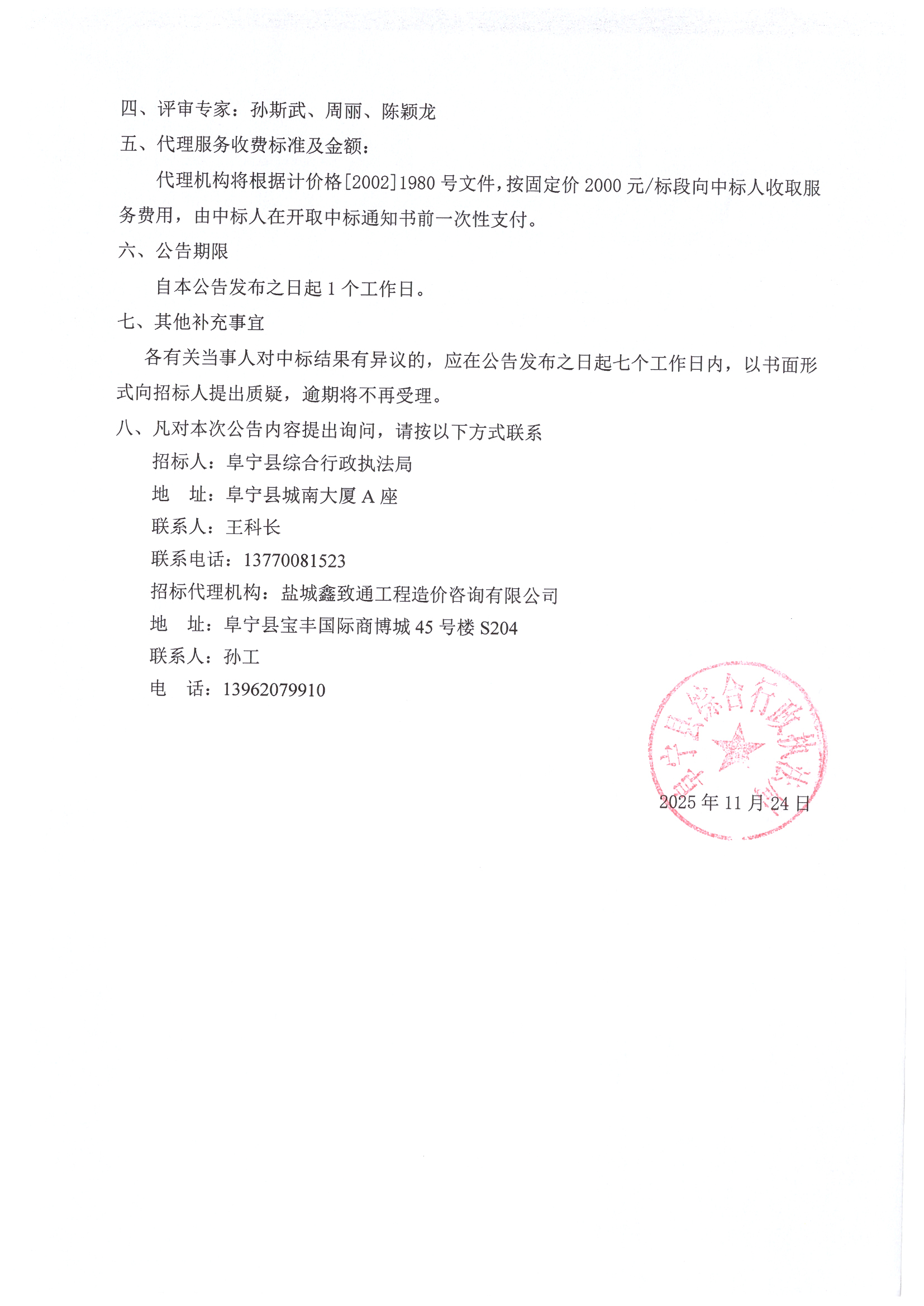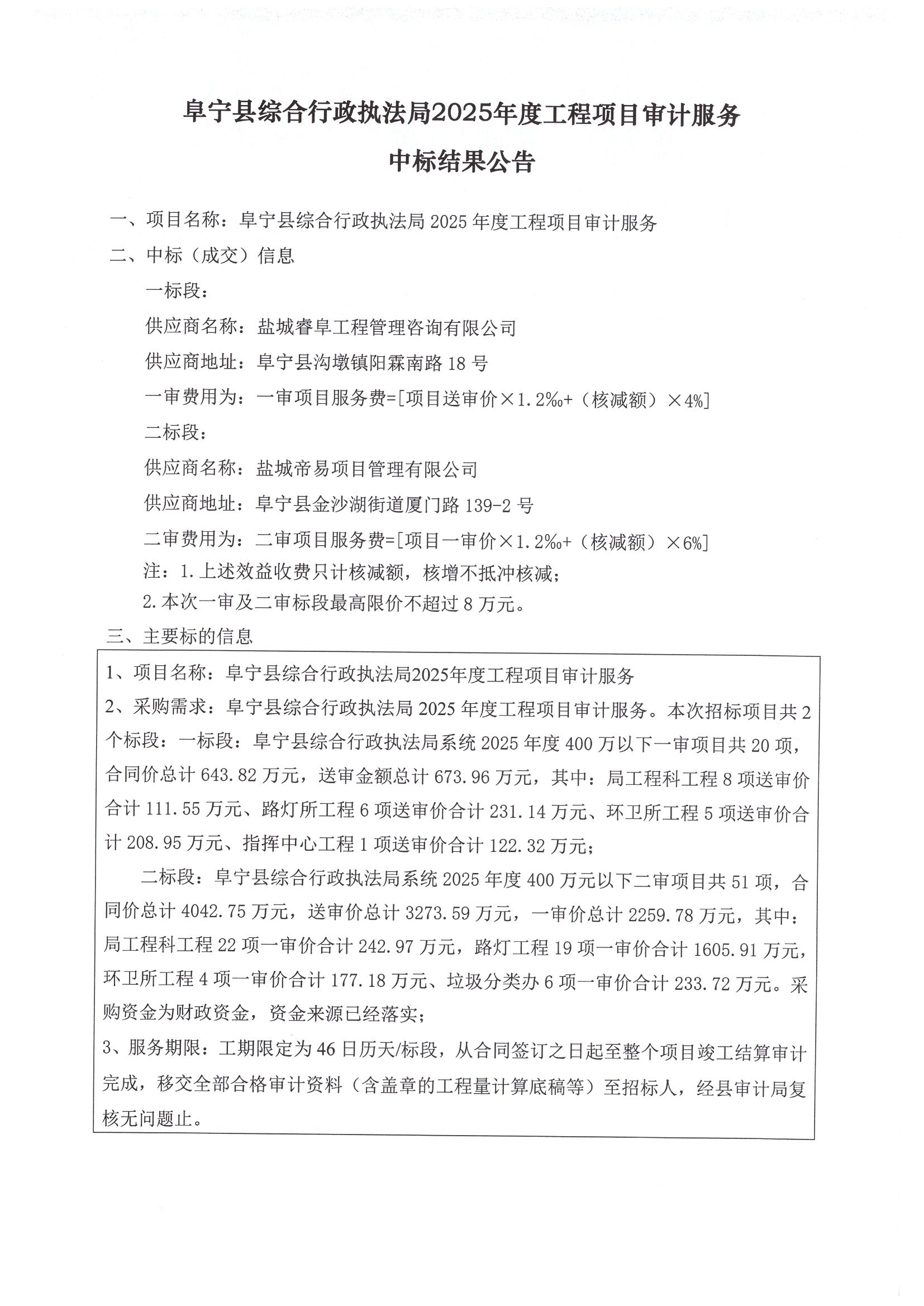 阜宁县综合行政执法局2025年度工程项目审计服务中标结果公告