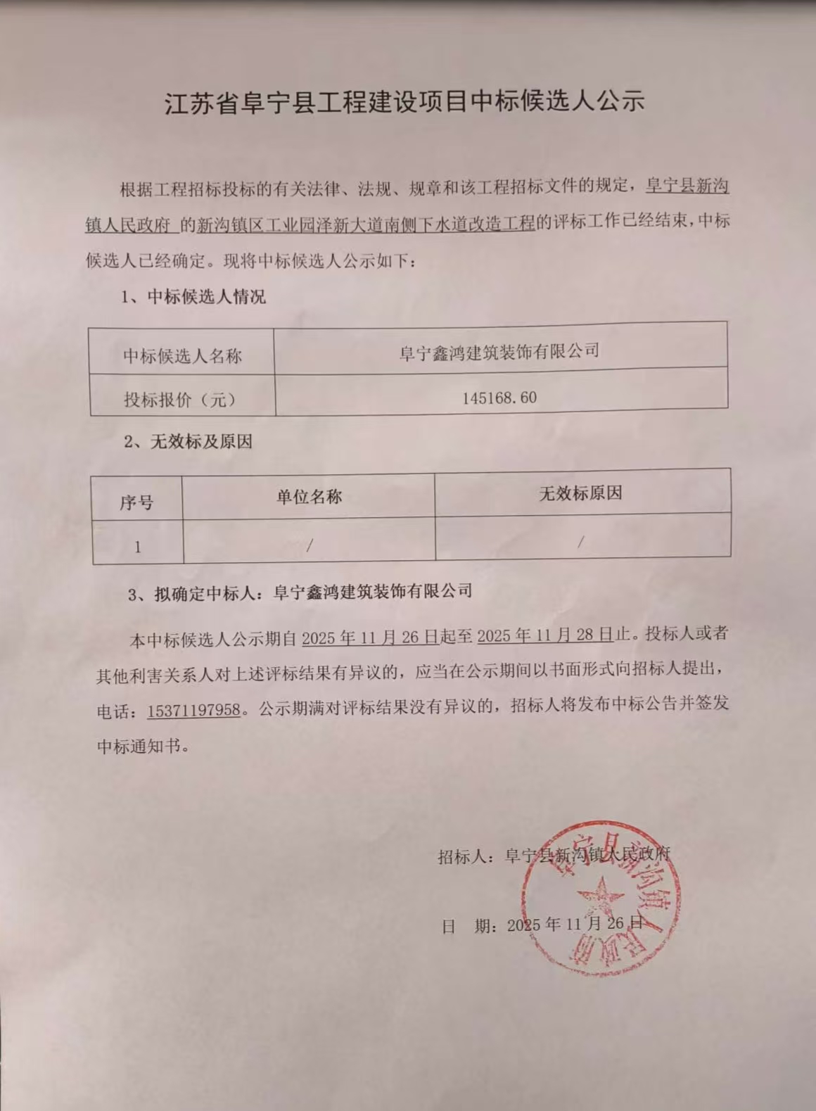 新沟镇区工业园泽新大道南侧下水道改造工程中标候选人公示