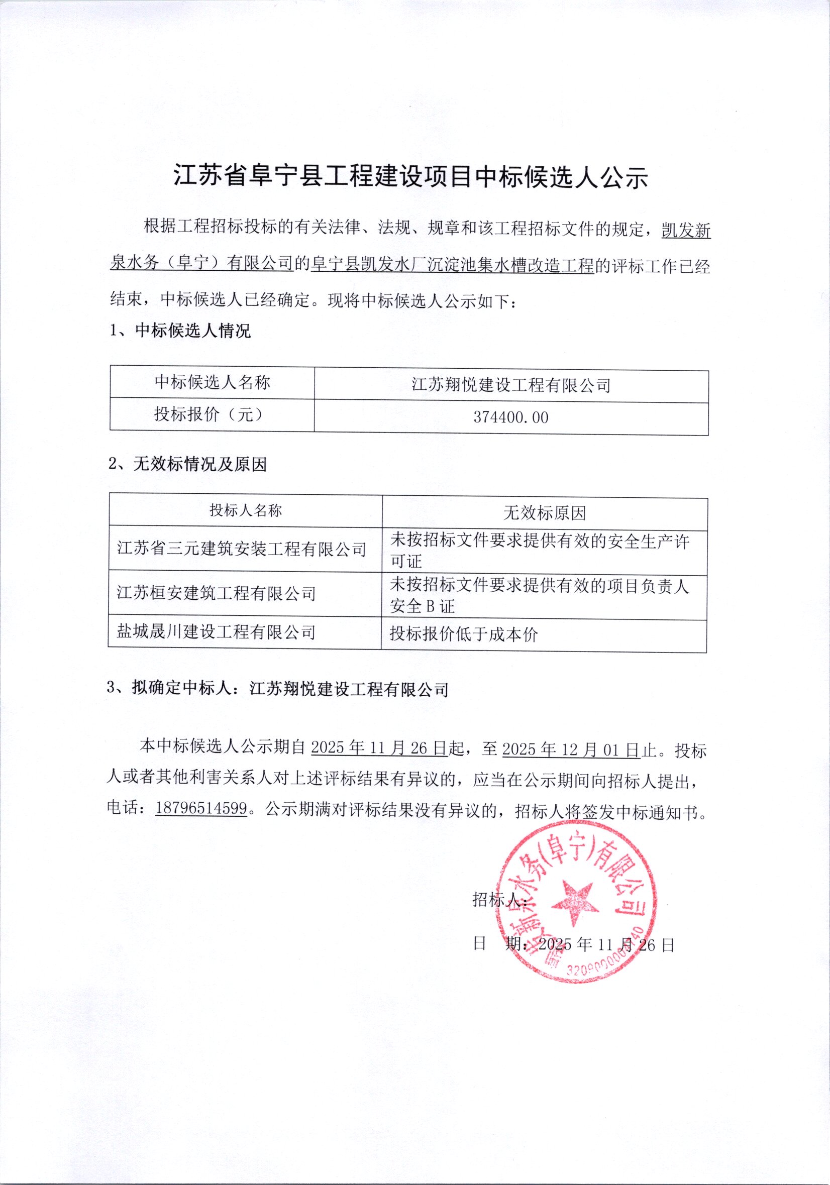 阜宁县凯发水厂沉淀池集水槽改造工程中标候选人公示