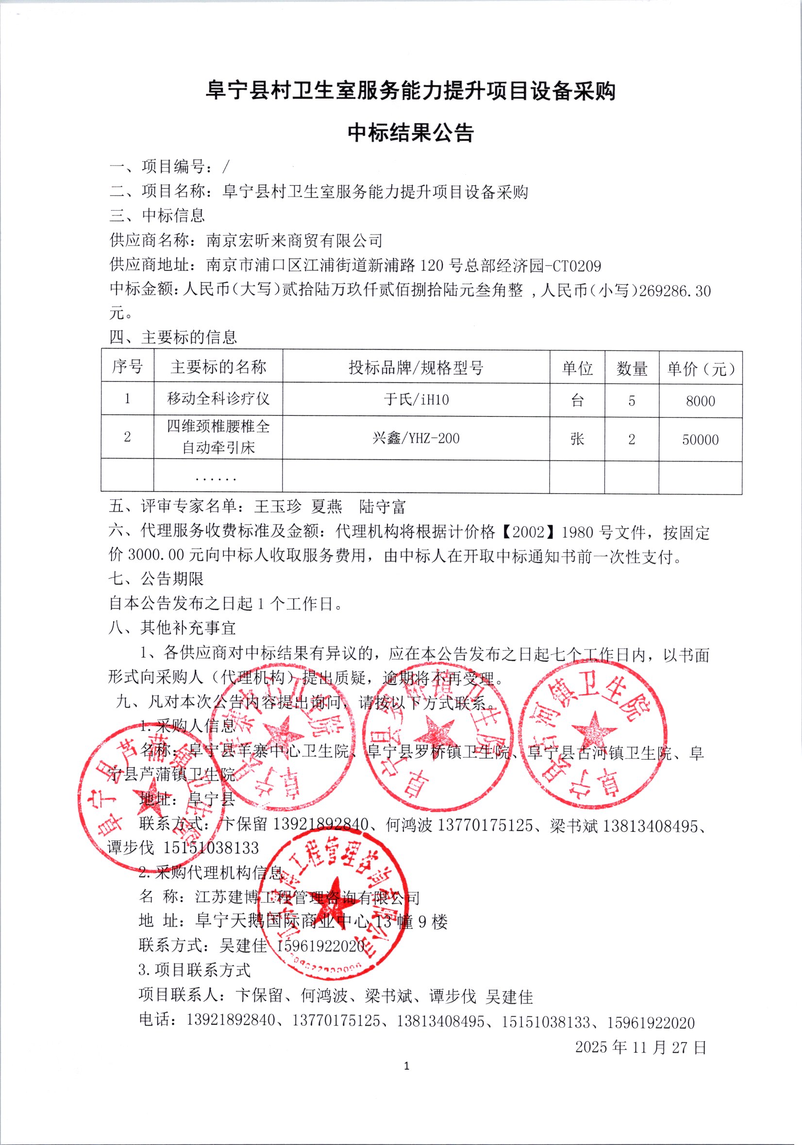 阜宁县村卫生室服务能力提升项目设备采购中标结果公告